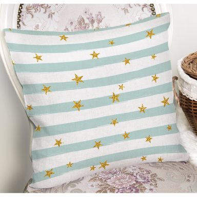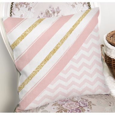 Beyaz Zeminli Pembe Yatay Çizgili Gold Detaylı Yıldız Desenli Kırlent Kılıfı