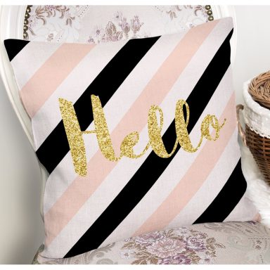 Beyaz Zemin Üzerinde Pembe Yatay Çizgili Gold Detaylı Hello Yazılı Yastık Kılıfı