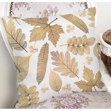 Beyaz Zemin Üzerinde Gold Detaylı Yaprak Desenli Modern Yastık Kırlent Kılıfı