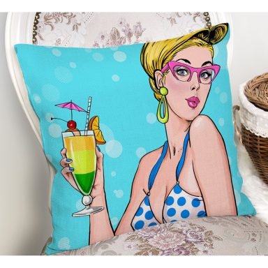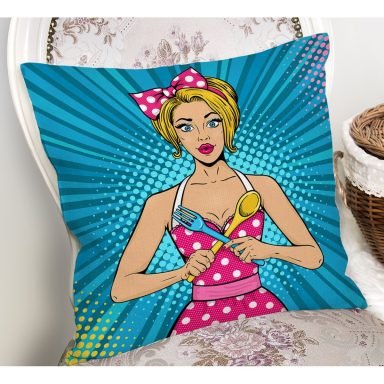 Mavi Zemini Popart Girl Desenli Dekoratif Yastık Kırlent Kılıfı