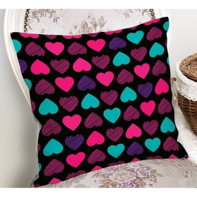 Siyah Zeminde Kalpler Özel Tasarımlı Dekoratif Yastık Kırlent Kılıfı