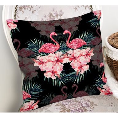 Siyah Zeminde Lilyum ve Flamingo Özel Tasarım Yastık Kırlent Kılıfı