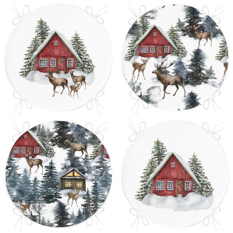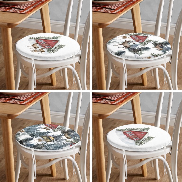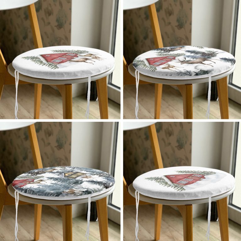 4’lü Bağ Evi Özel Tasarım Kış Temalı Dijital Baskılı Modern Yuvarlak Fermuarlı Sandalye Minderi Seti