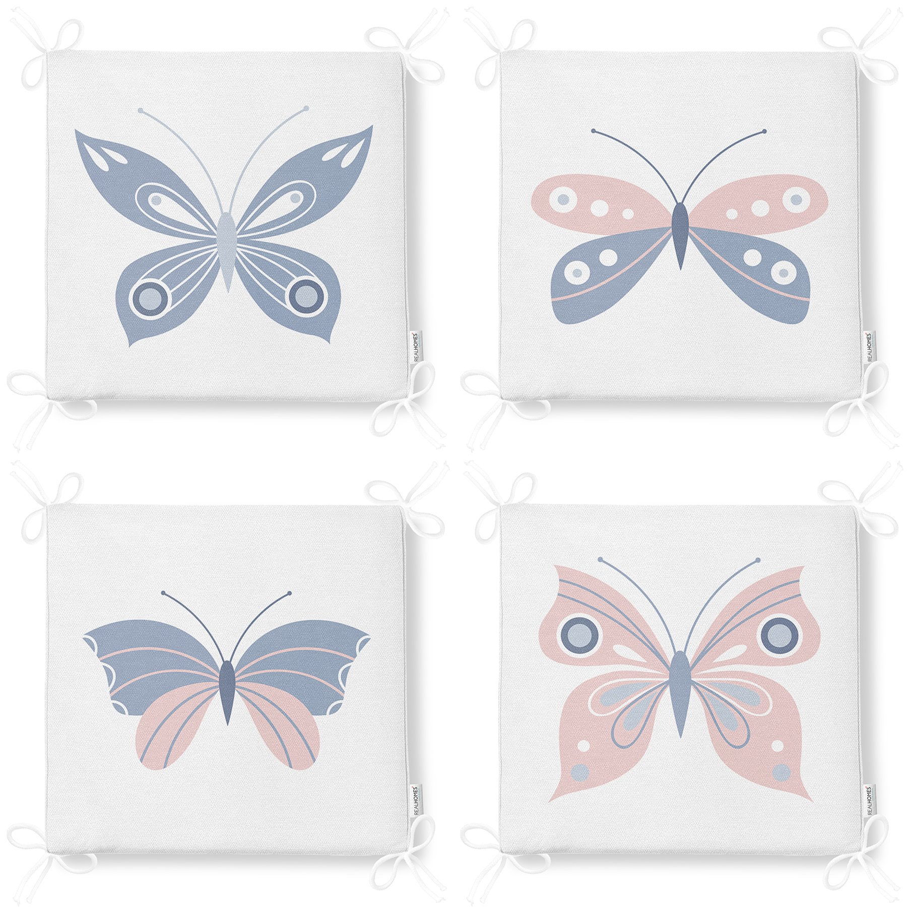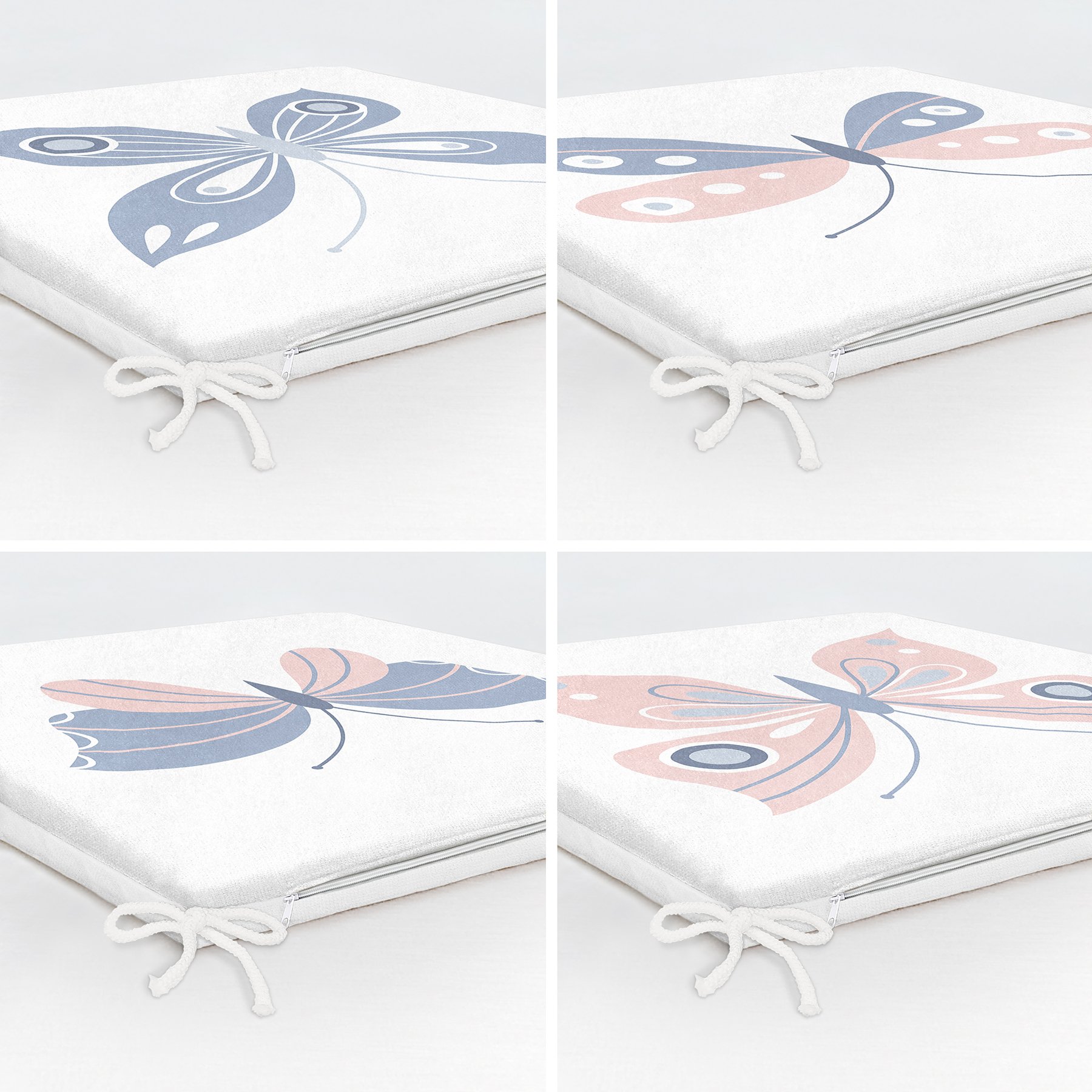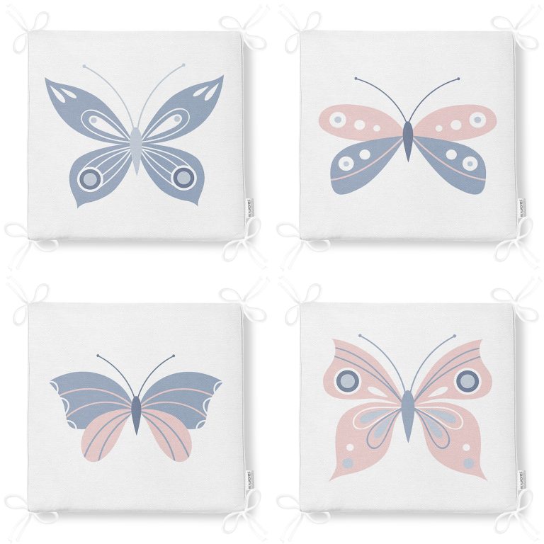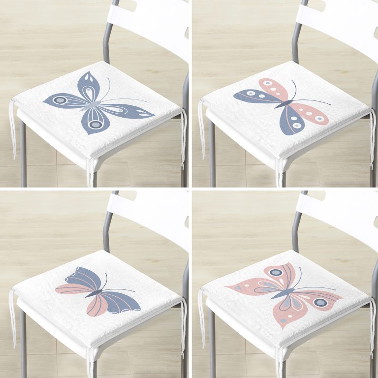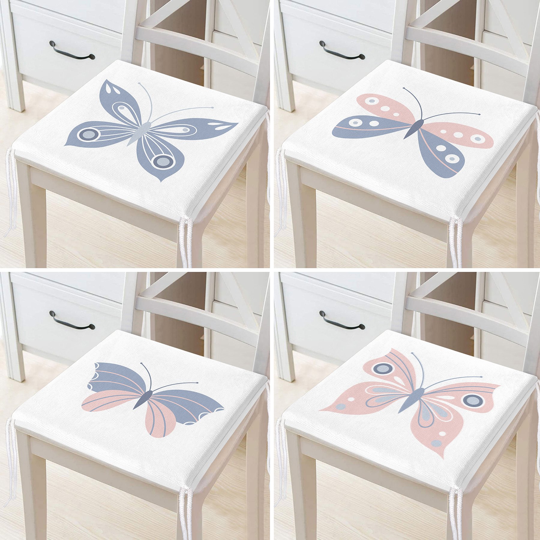 4’lü Beyaz Zemin Pembe & Mavi Kelebek Tasarımlı Dijital Baskılı Modern Fermuarlı Sandalye Minderi Seti