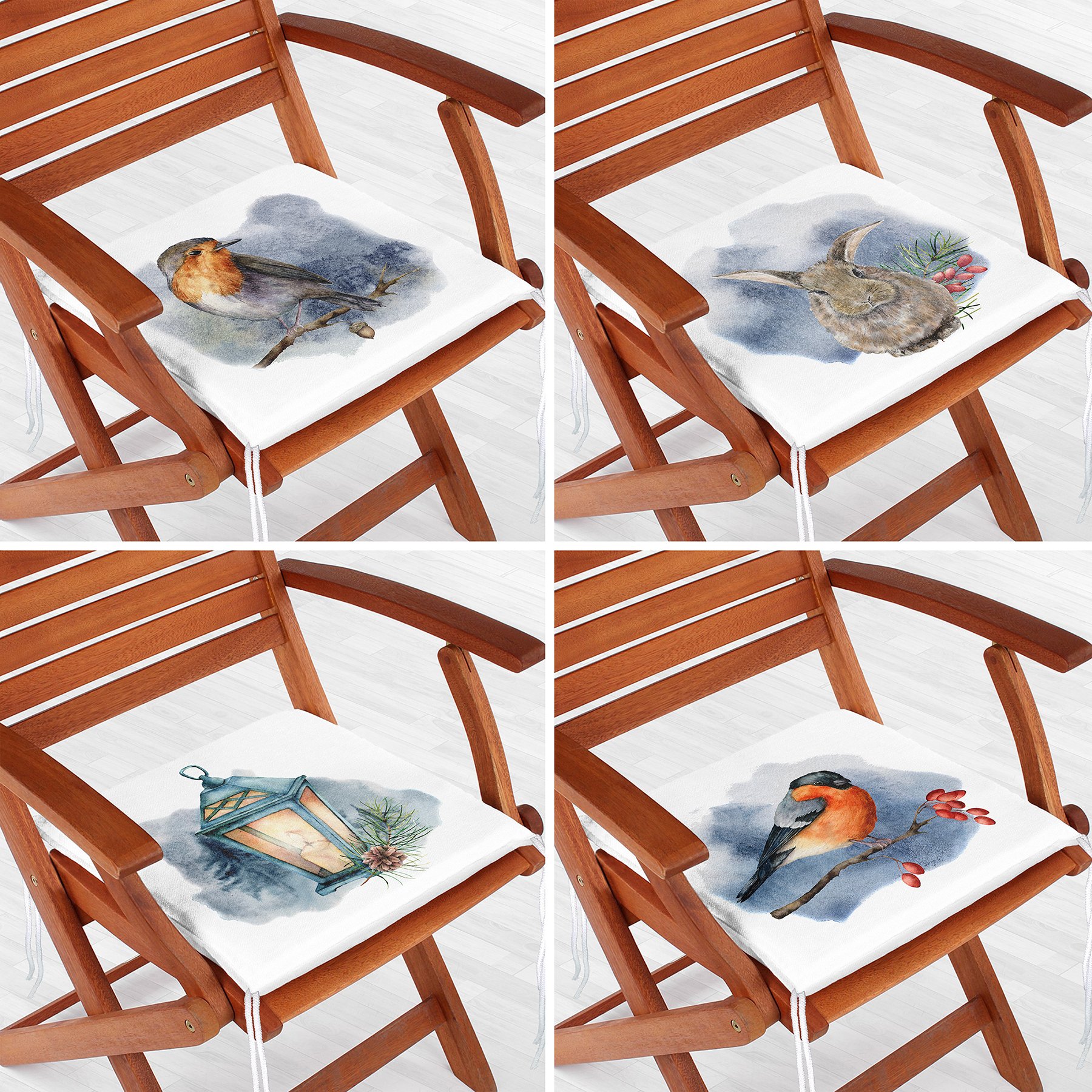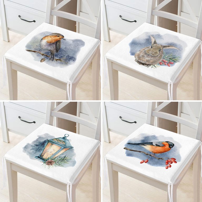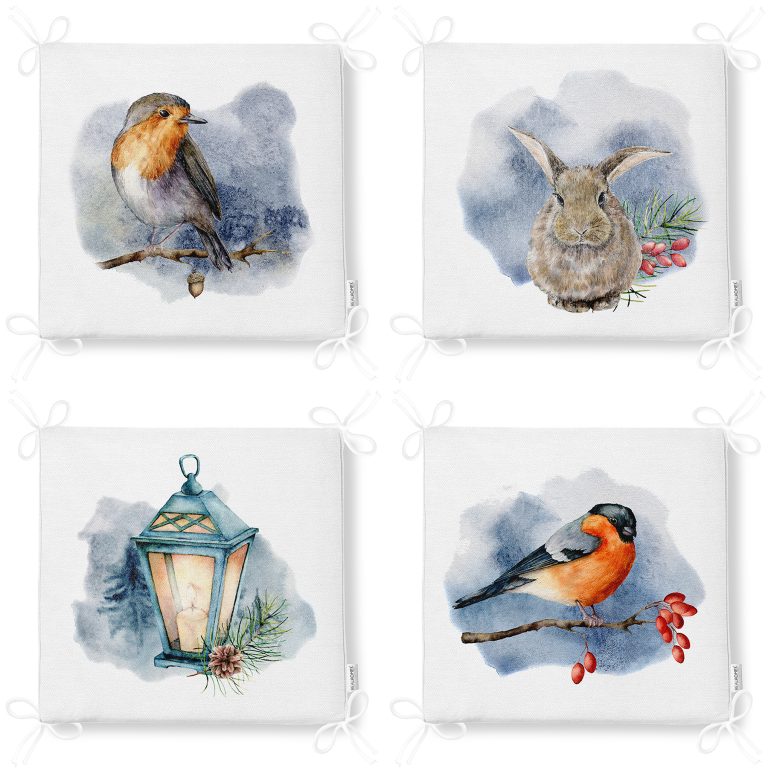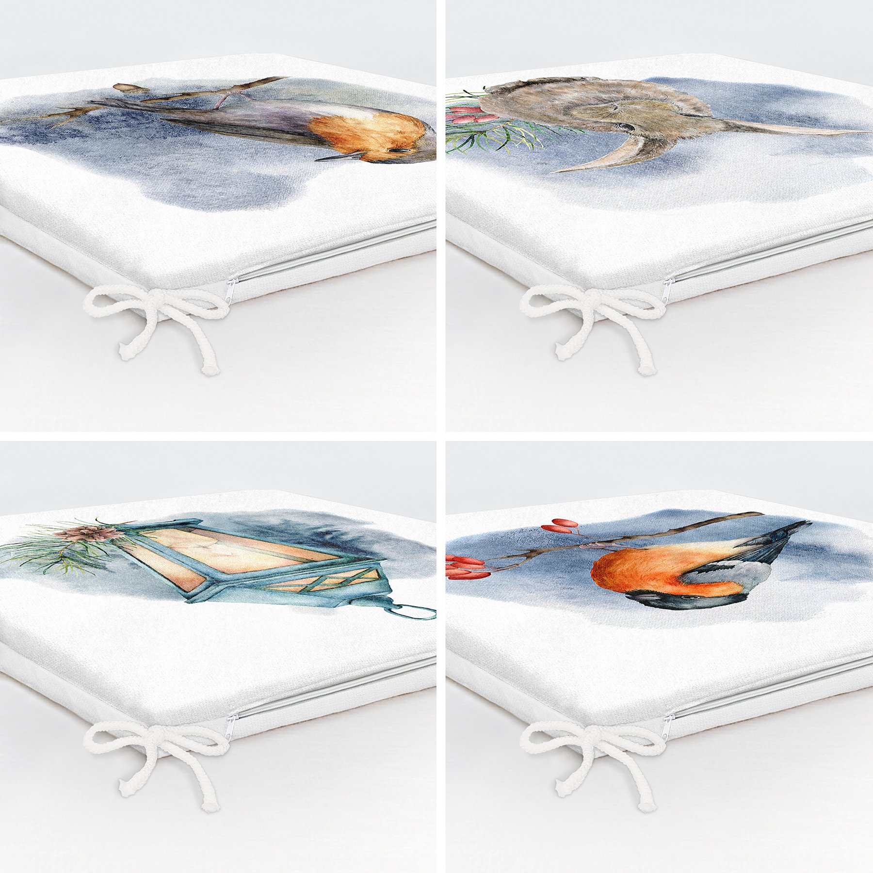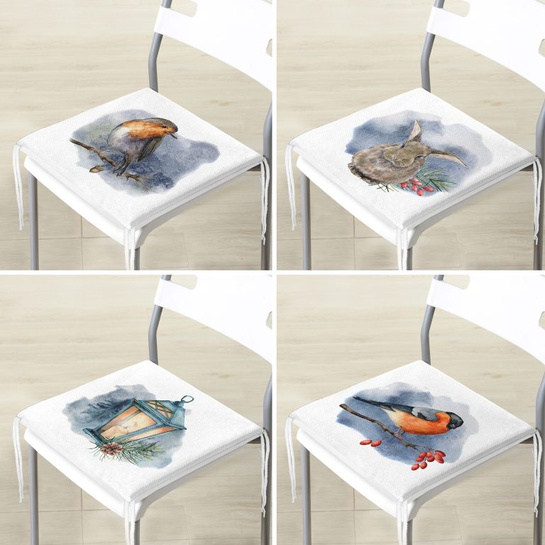 4’lü Beyaz Zemin Suluboya Üzerinde Hayvan Tasarımlı Dijital Baskılı Modern Fermuarlı Sandalye Minderi Seti