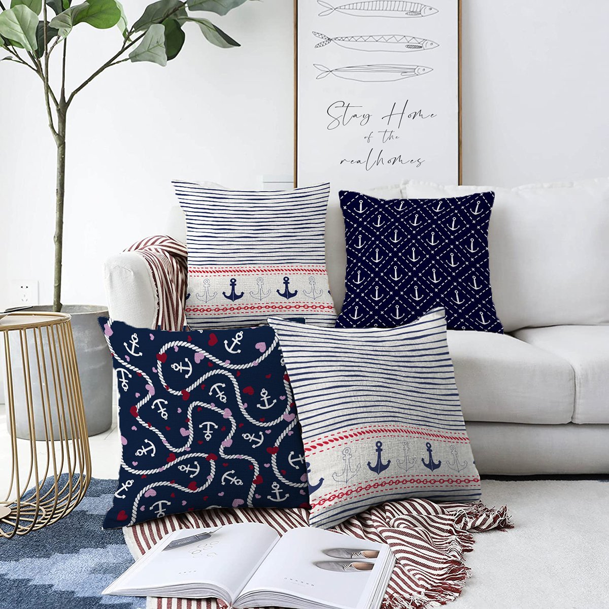 4’lü Renkli Zemin Üzerinde Denizci Desenli Modern Raşel Kadife Yastık Kırlent Kılıf Seti