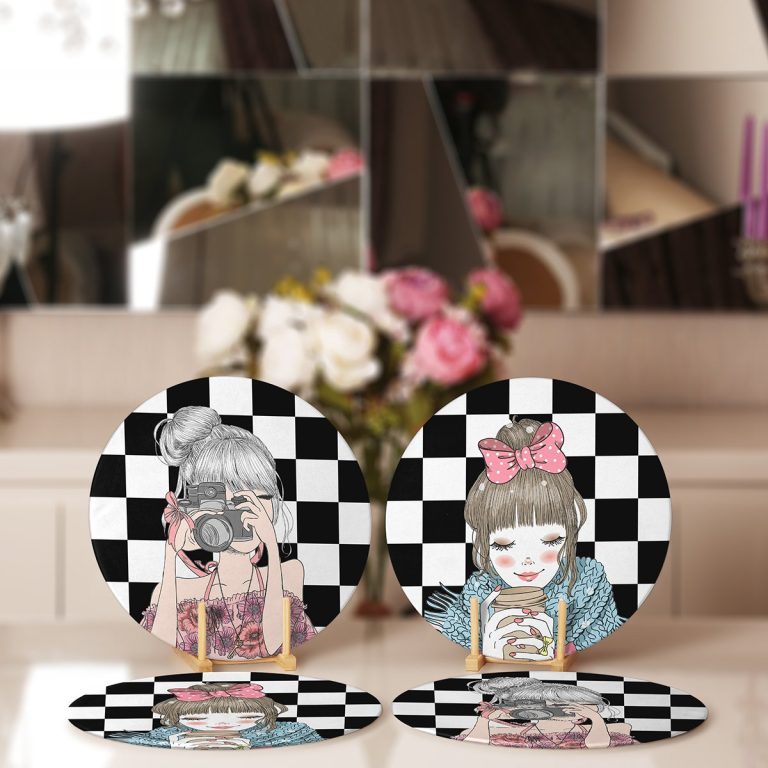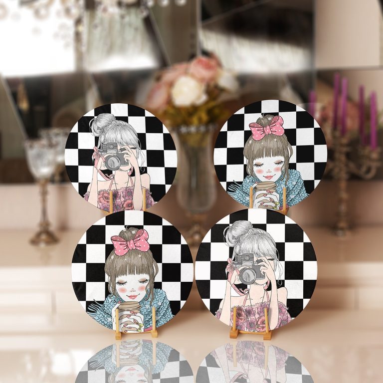 4’lü Dama Zeminli Fotoğraf Çeken & Kahve İçen Kız Tasarımlı Servis Altlığı & Supla