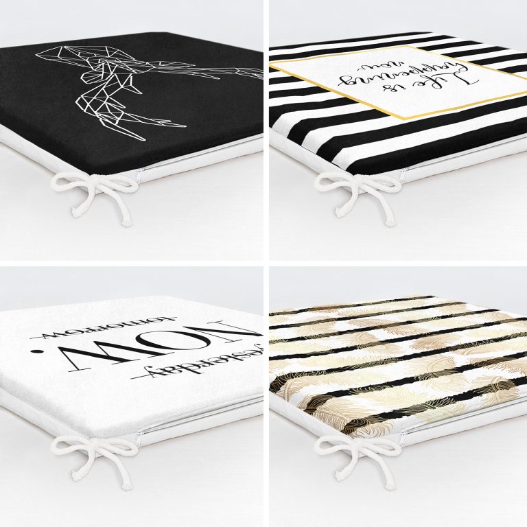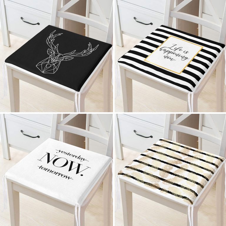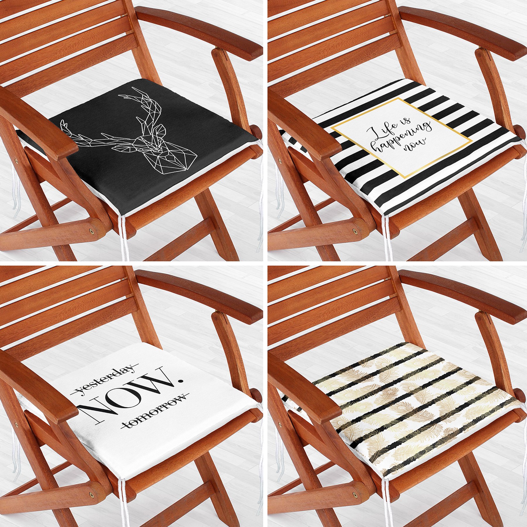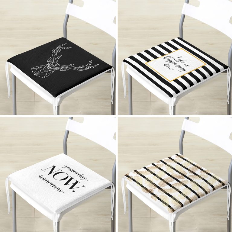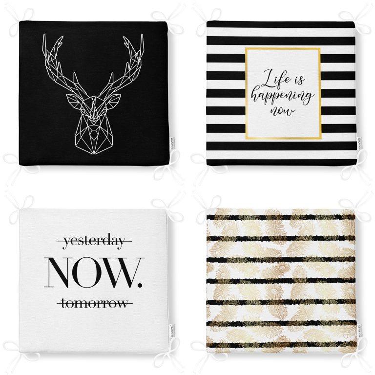 4’lü Gold Yazılı Siyah Beyaz Zeminli Fermuarlı Sandalye Minderi Seti