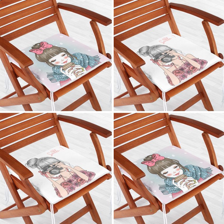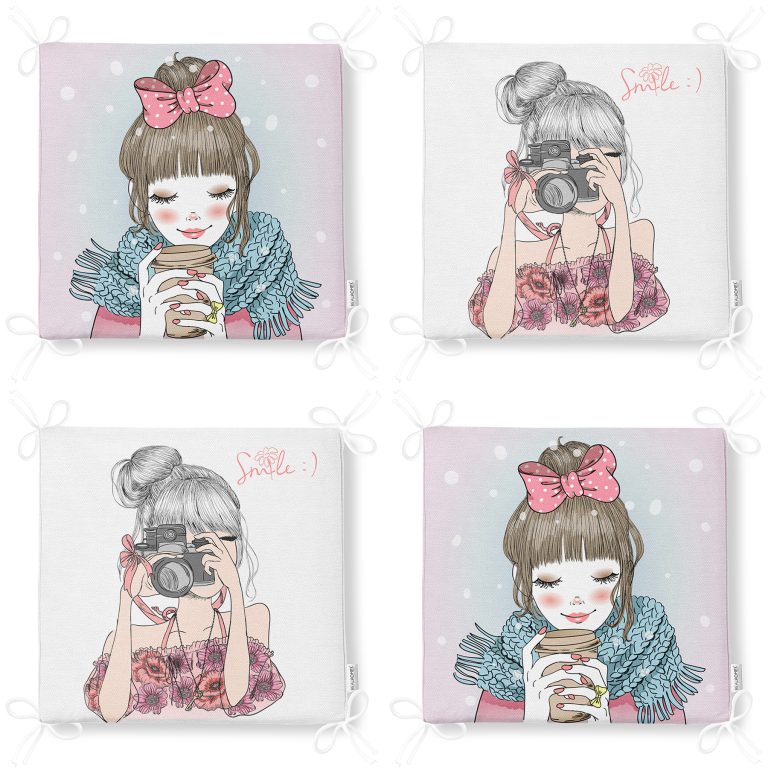 4’lü Kahve İçen ve Fotoğraf Çeken Kız Fermuarlı Sandalye Minderi Seti