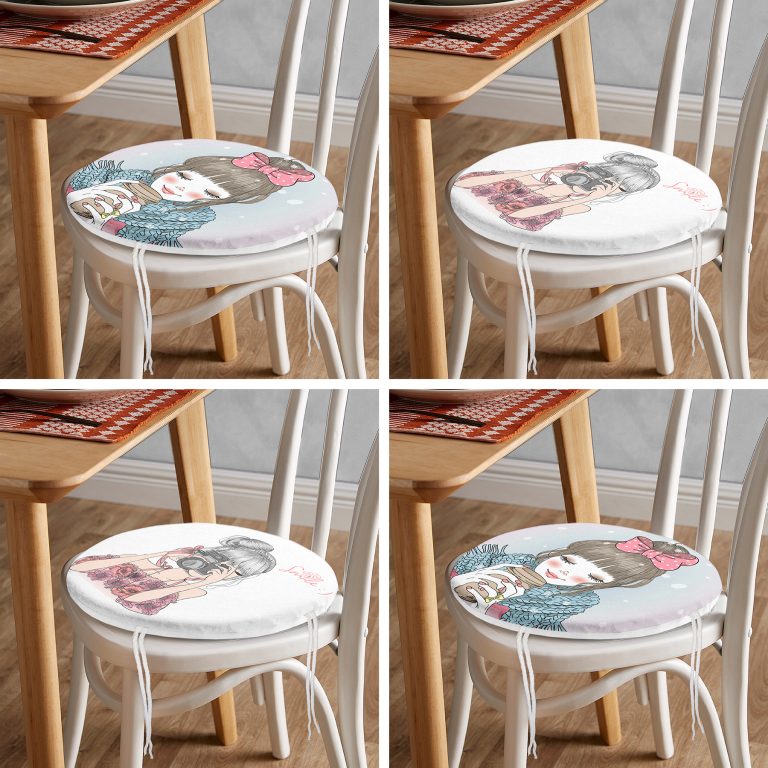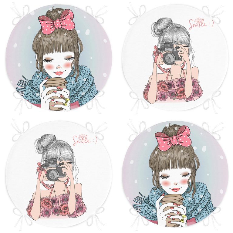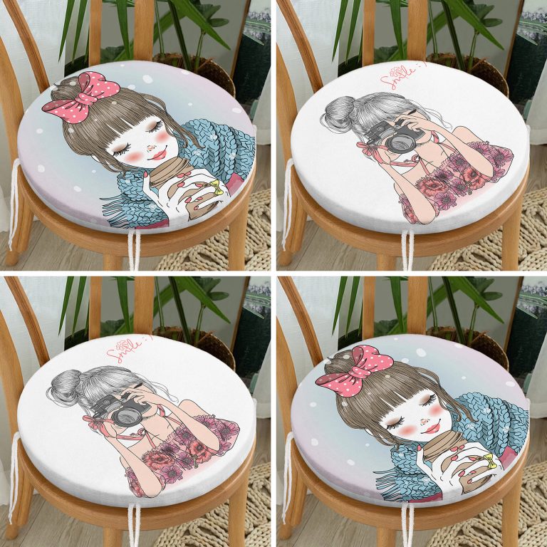 4’lü Kahve İçen ve Fotoğraf Çeken Kız Yuvarlak Fermuarlı Sandalye Minderi Seti