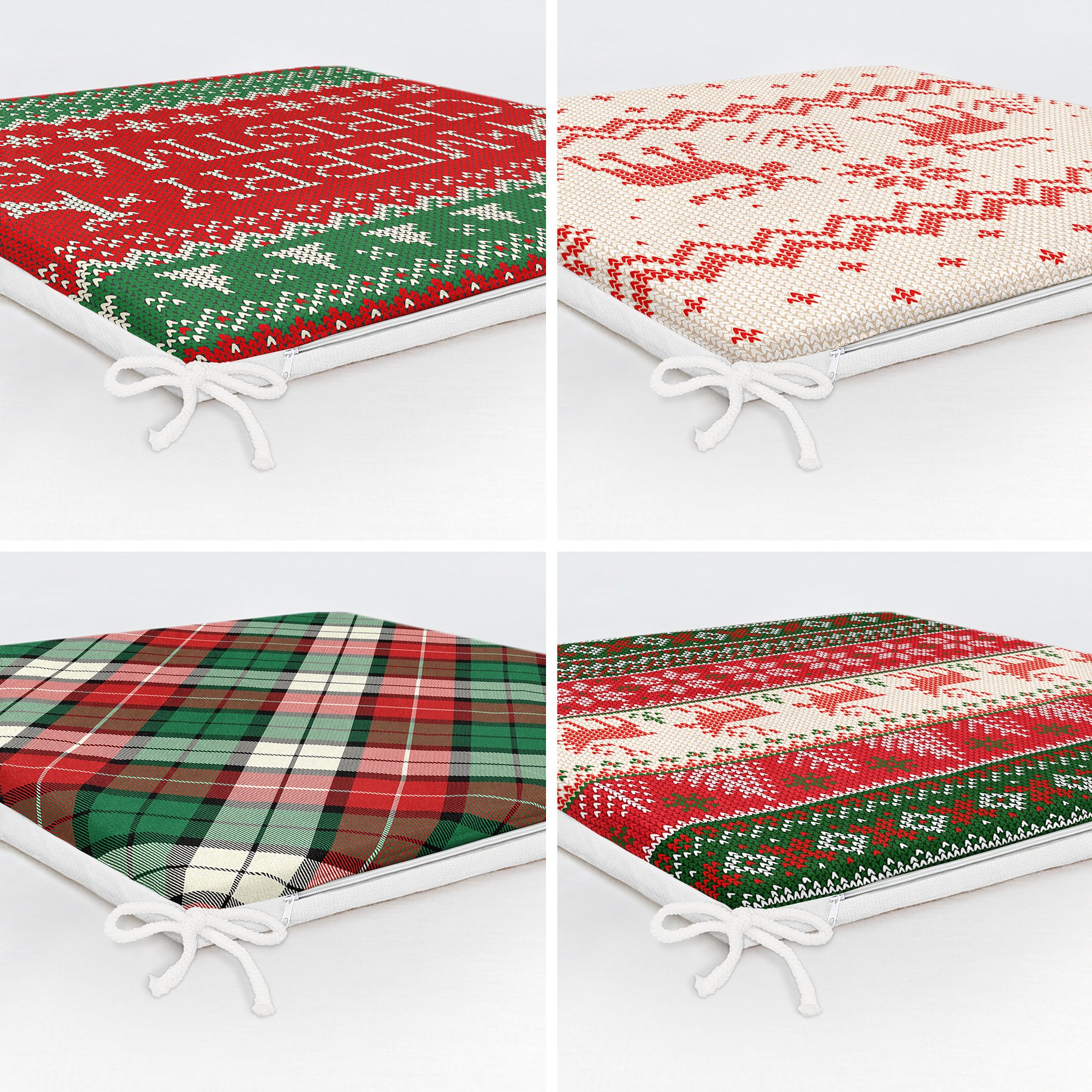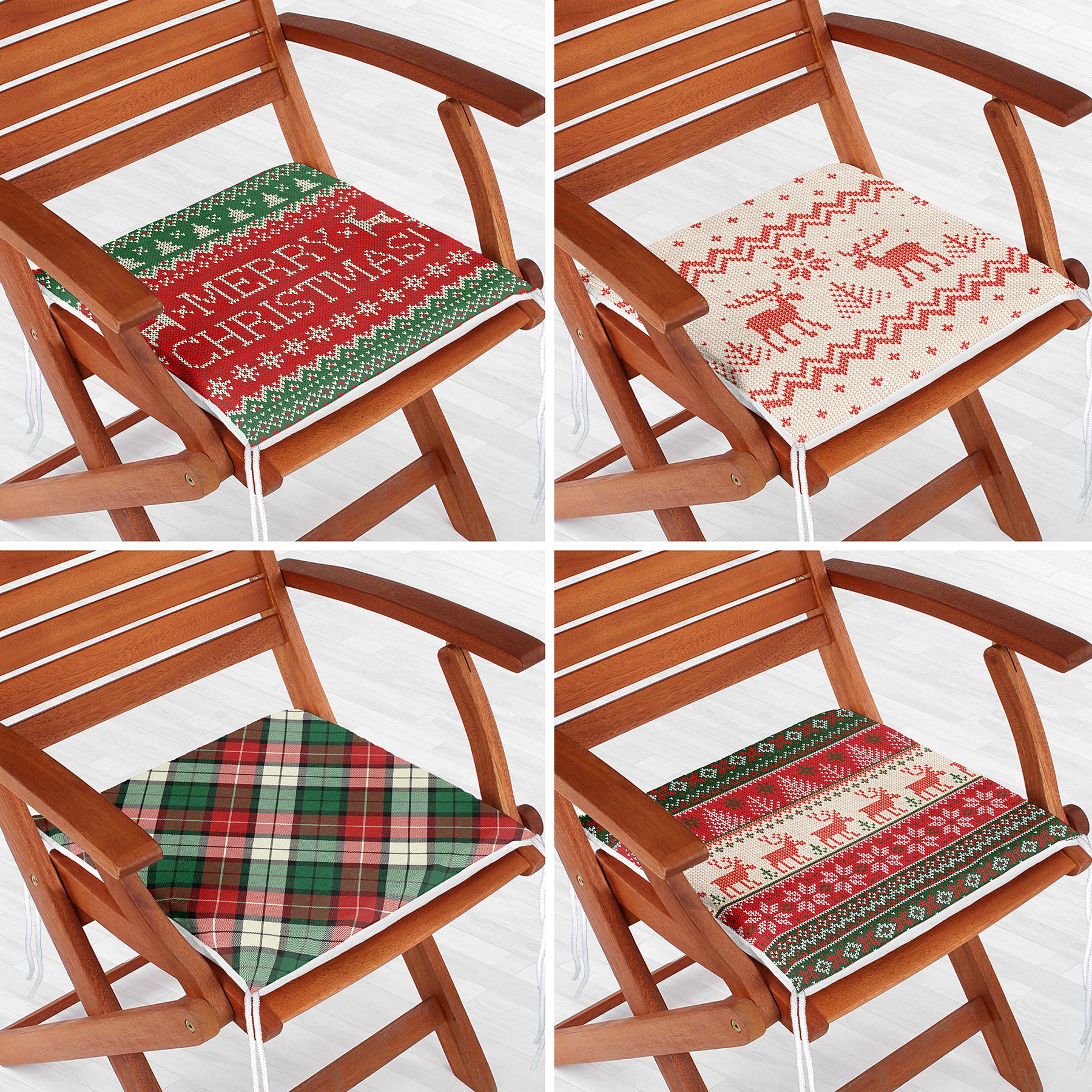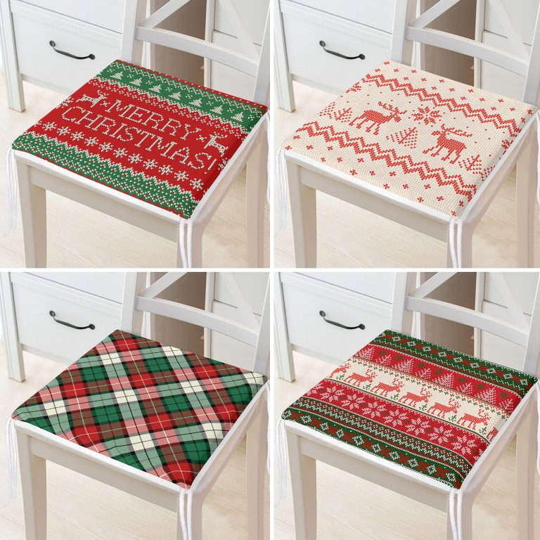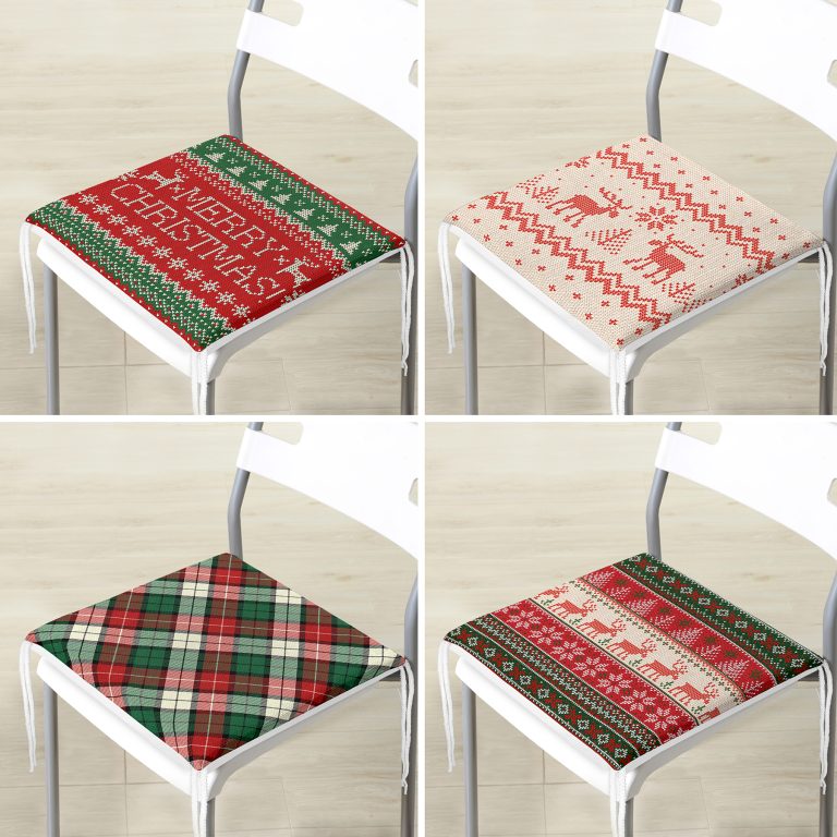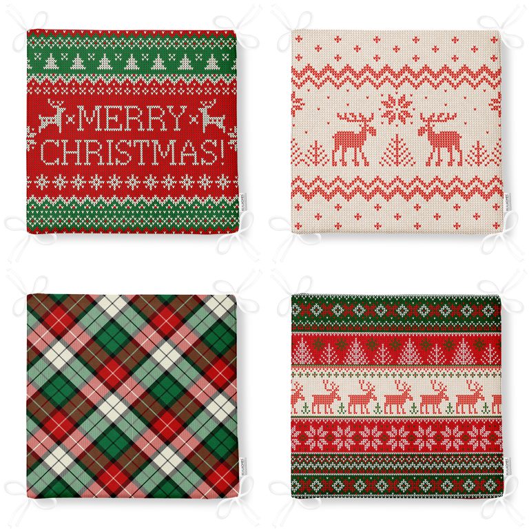 4’lü Kırmızı Yeşil Renk Tonlarında Geyik ve Ekose Temalı Fermuarlı Sandalye Minderi Seti