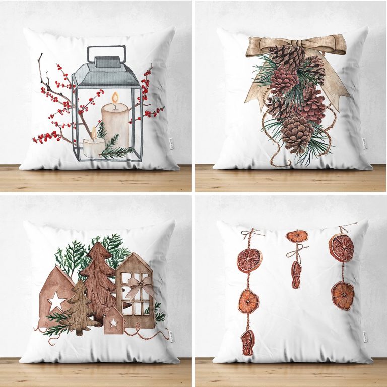 4’lü Kozalak & Şamdan Tasarımlı Dijital Baskılı Modern Süet Kırlent Kılıfı Seti