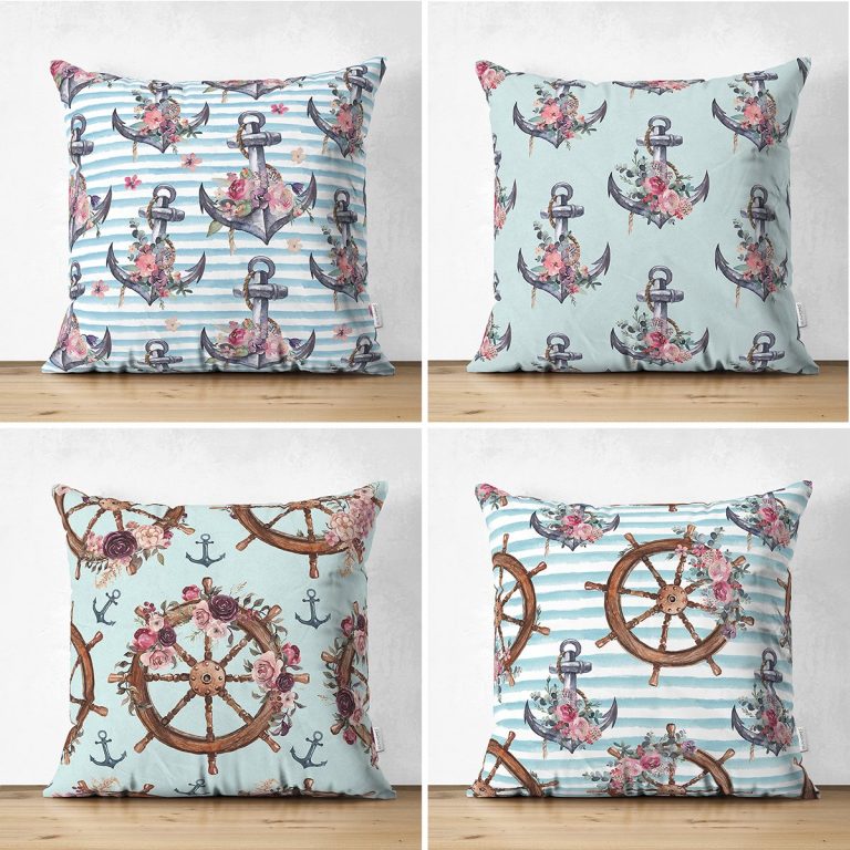 4’lü Mavi Zemin Dümen & Çapa Motifli Dijital Baskılı Modern Süet Kırlent Kılıfı Seti