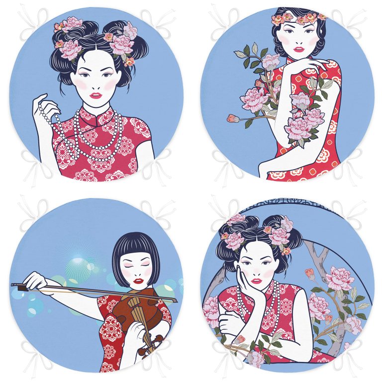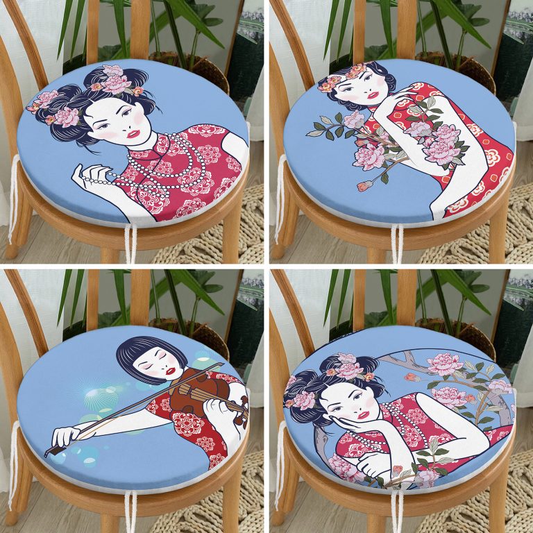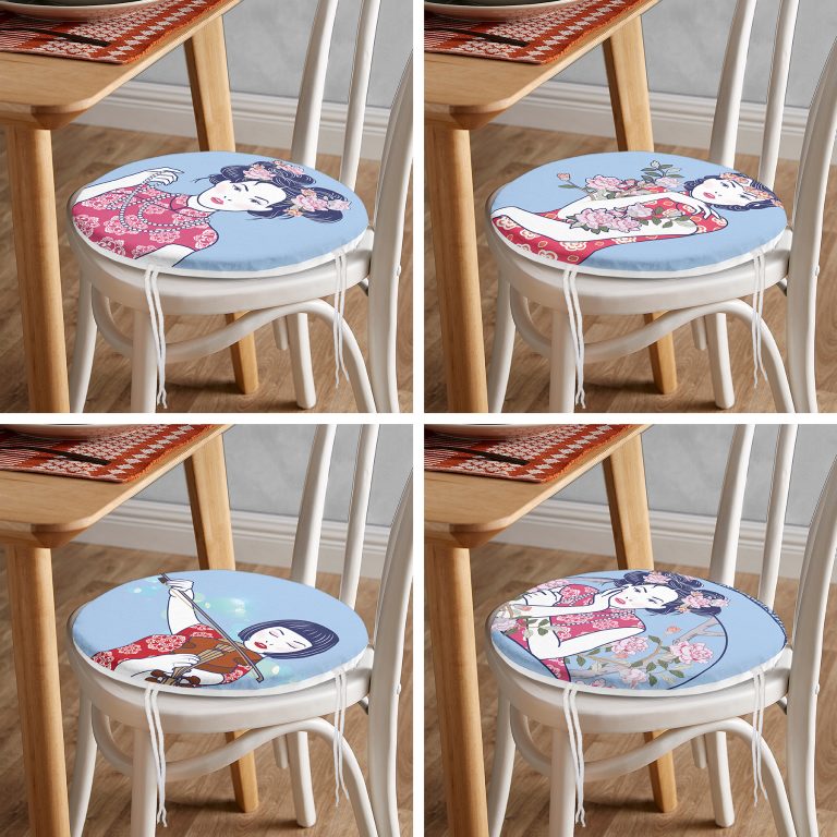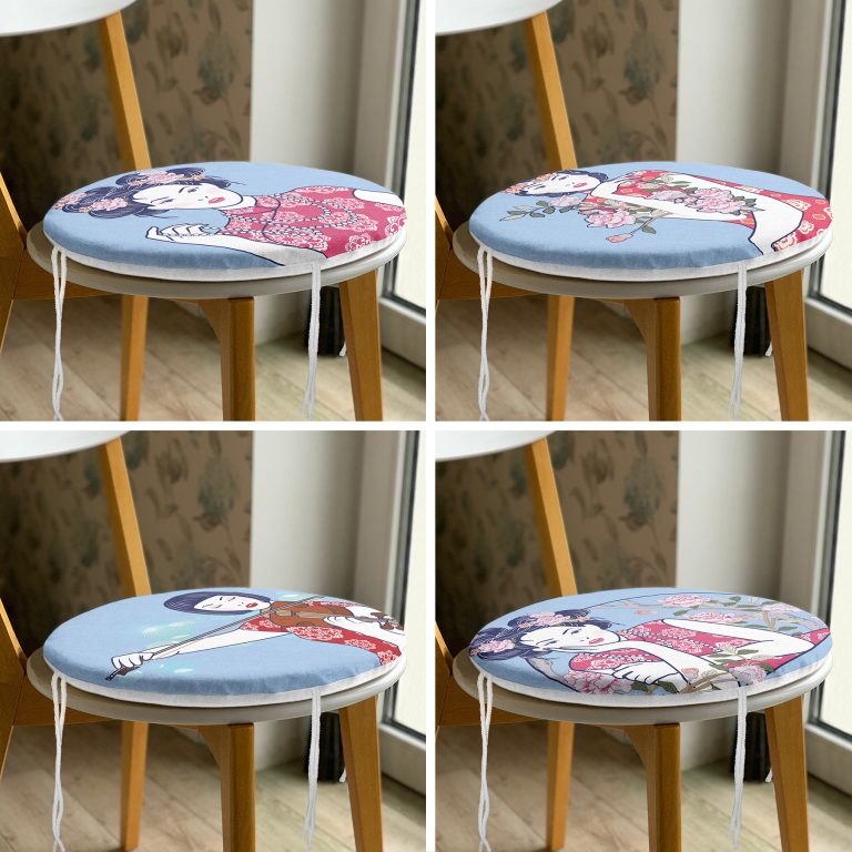4’lü Mavi Zemin Üzerimde Japon Kız Motifli Yuvarlak Fermuarlı Sandalye Minderi Seti