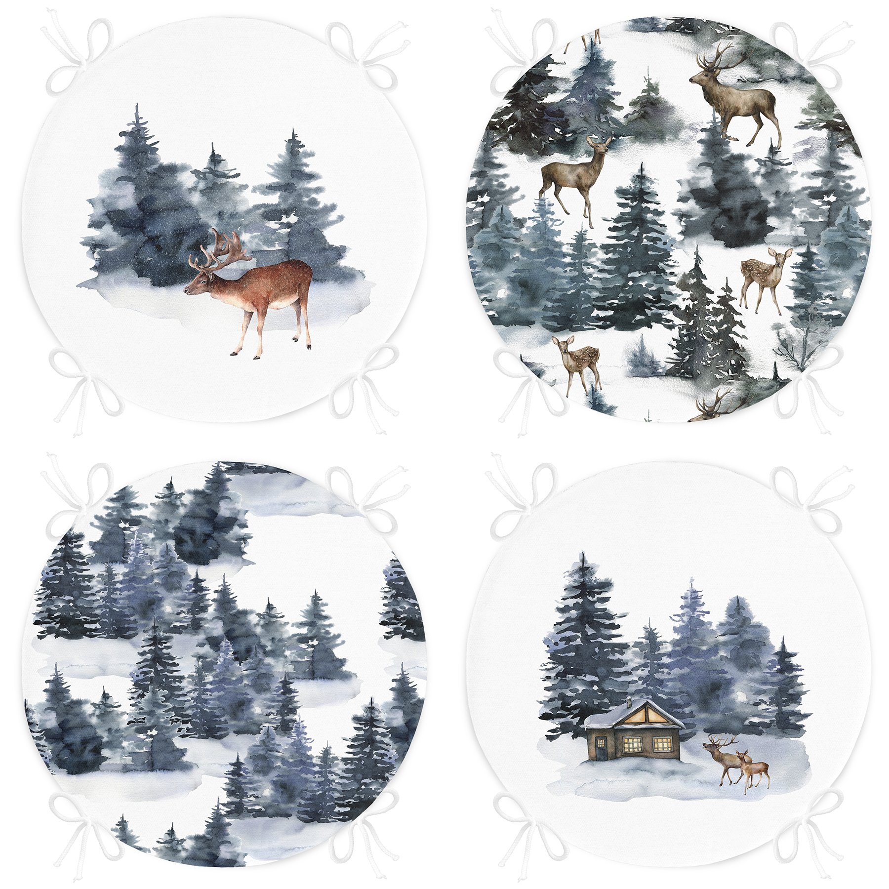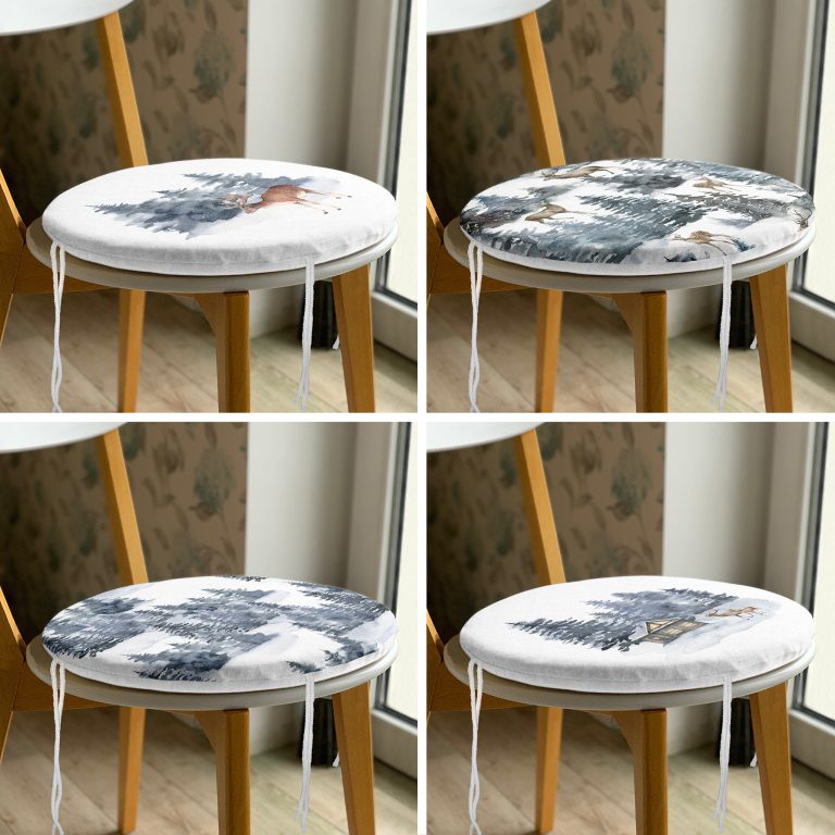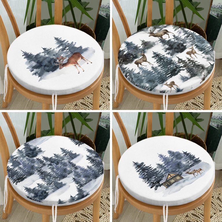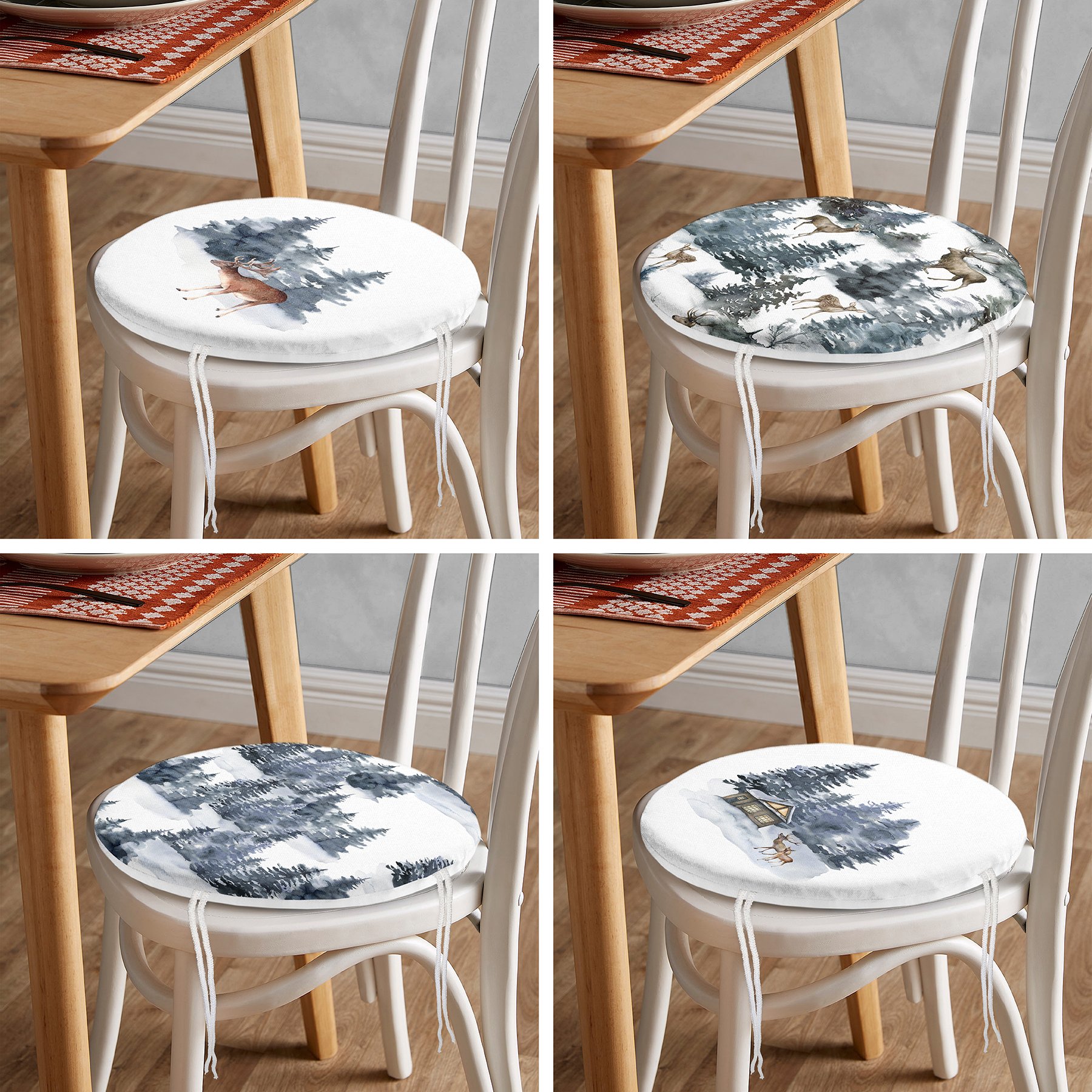 4’lü Özel Tasarım Geyikler & Çam Ağacı Motifli Dijital Baskılı Modern Yuvarlak Fermuarlı Sandalye Minderi Seti