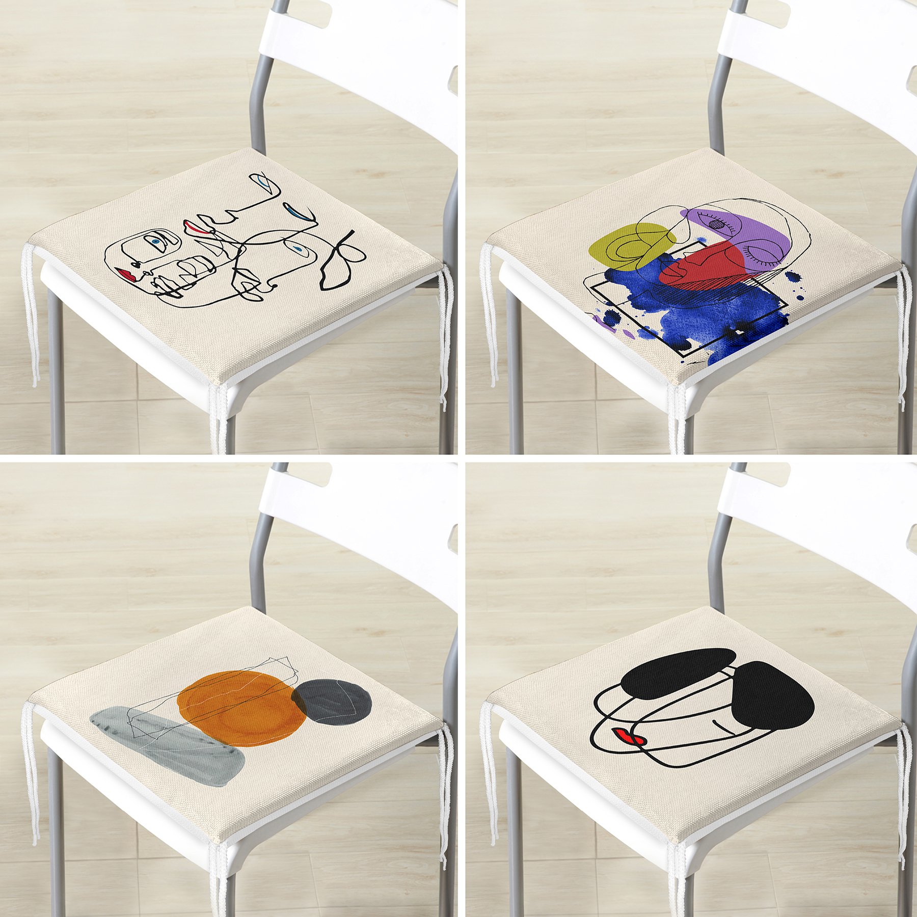 4’lü Renkli One Line Çizimli Dijital Baskılı Fermuarlı Sandalye Minderi Seti