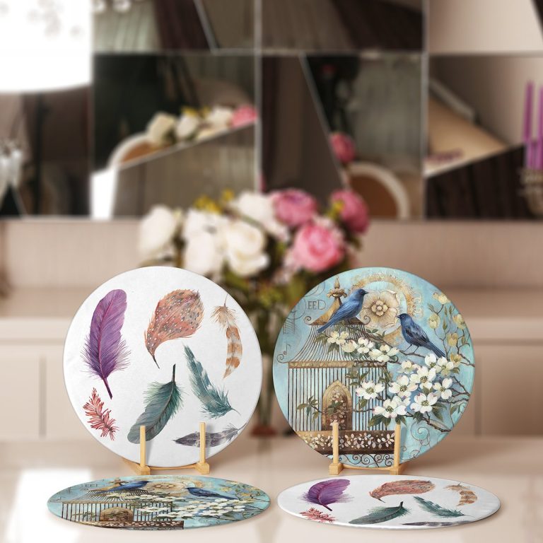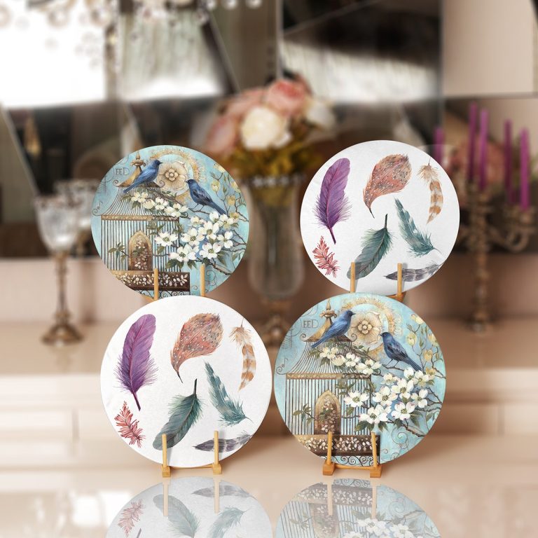 4’lü Renkli Tüy & Mavi Saka Kuşu Tasarımlı Servis Altlığı & Supla