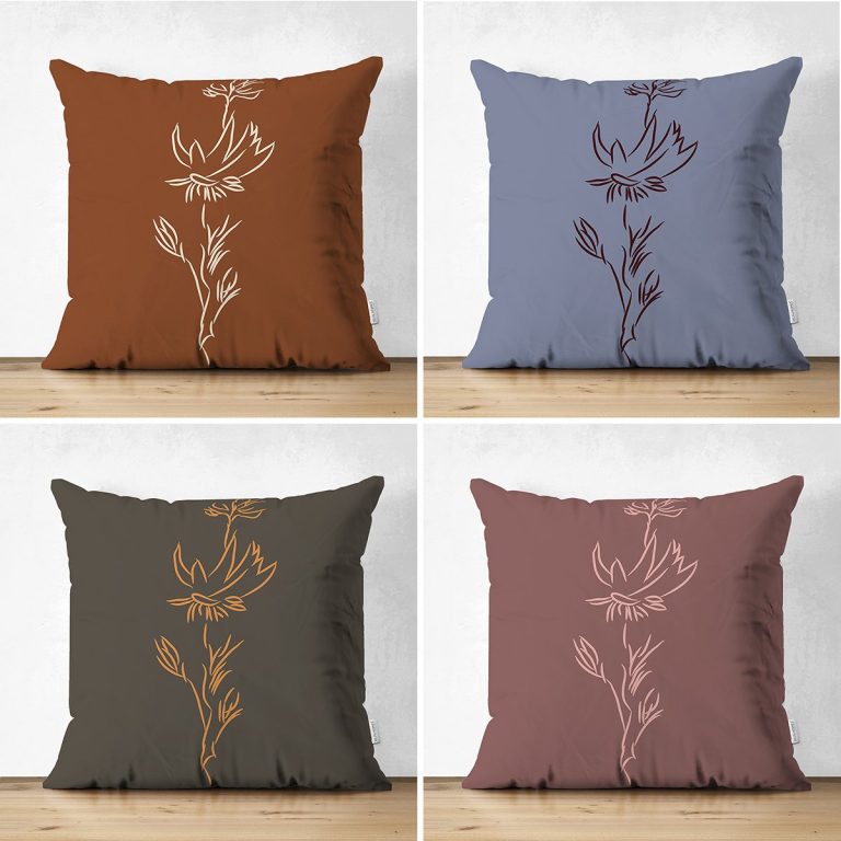 4’lü Renkli Zemin Onedraw Çiçek Çizimli Dijital Baskılı Modern Süet Kırlent Kılıfı Seti