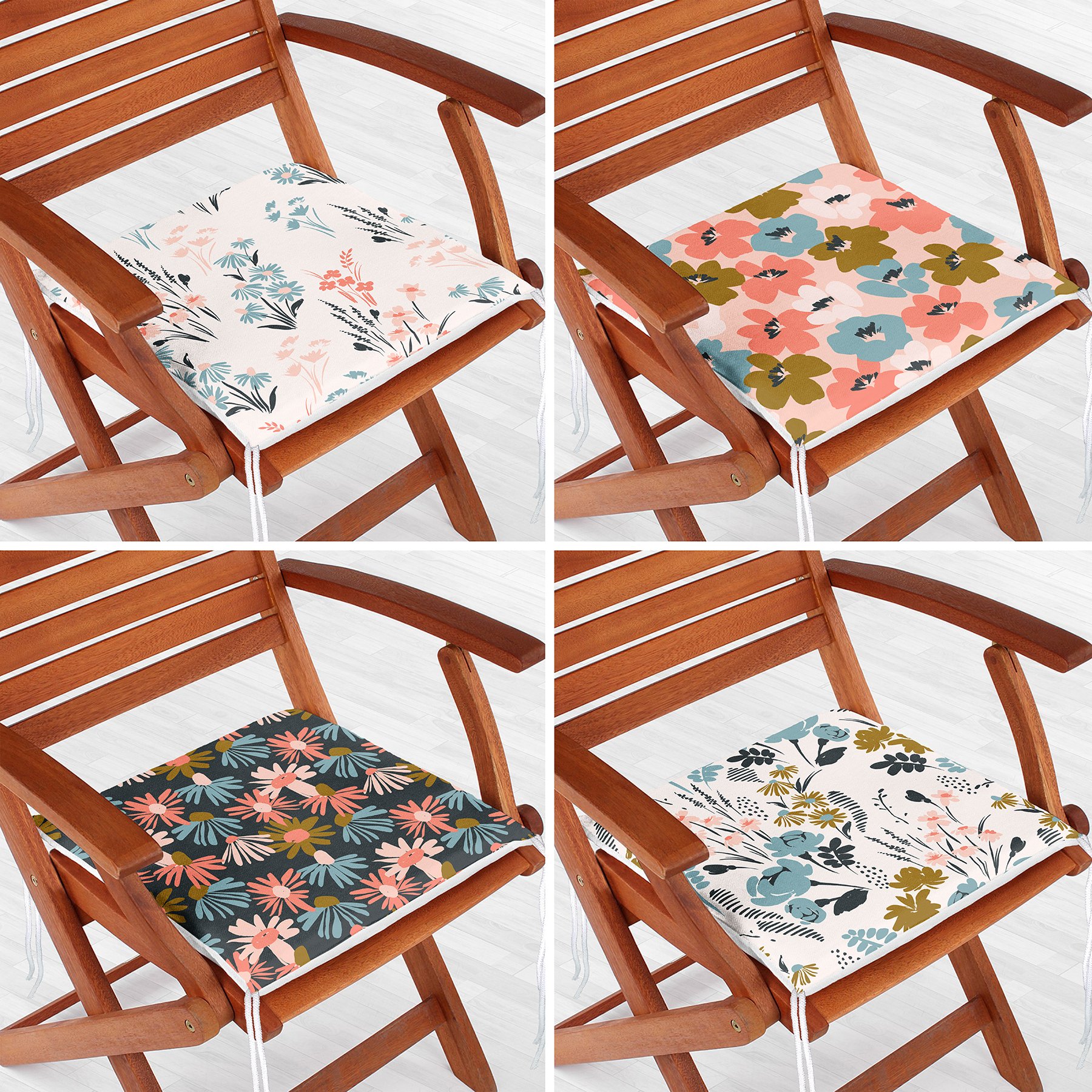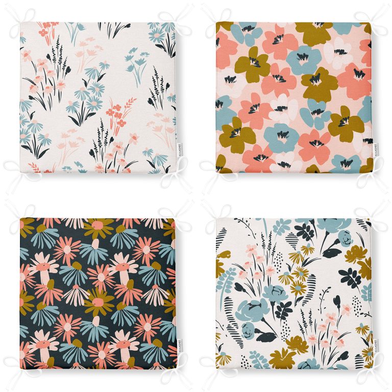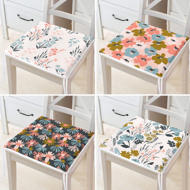 4’lü Renkli Zemin Üzerinde Çiçek Desenli Modern Fermuarlı Sandalye Minderi Seti