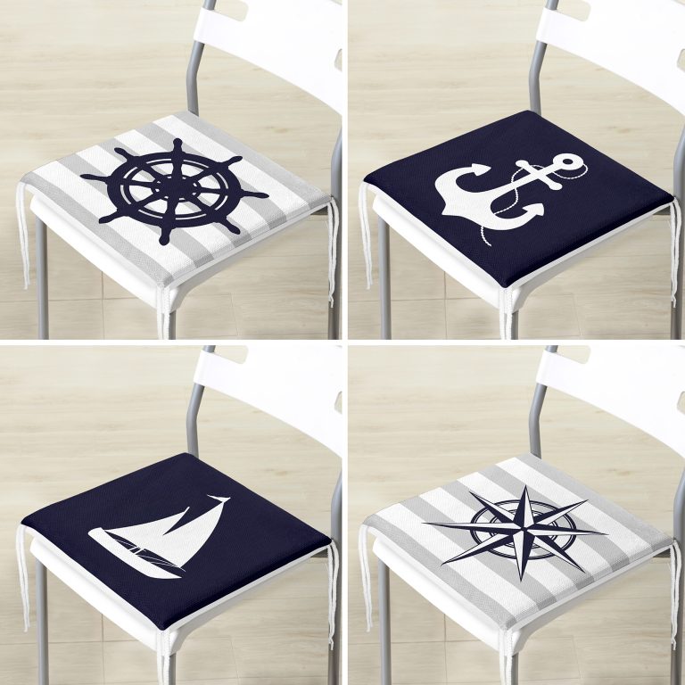 4’lü Renkli Zemin Üzerinde Denizci Desenli Modern Fermuarlı Sandalye Minderi Seti