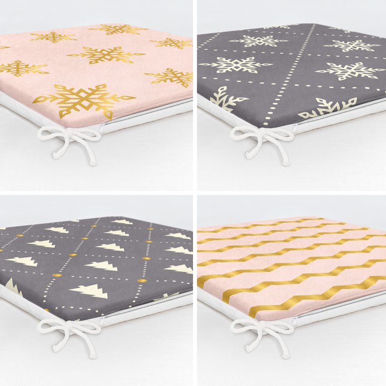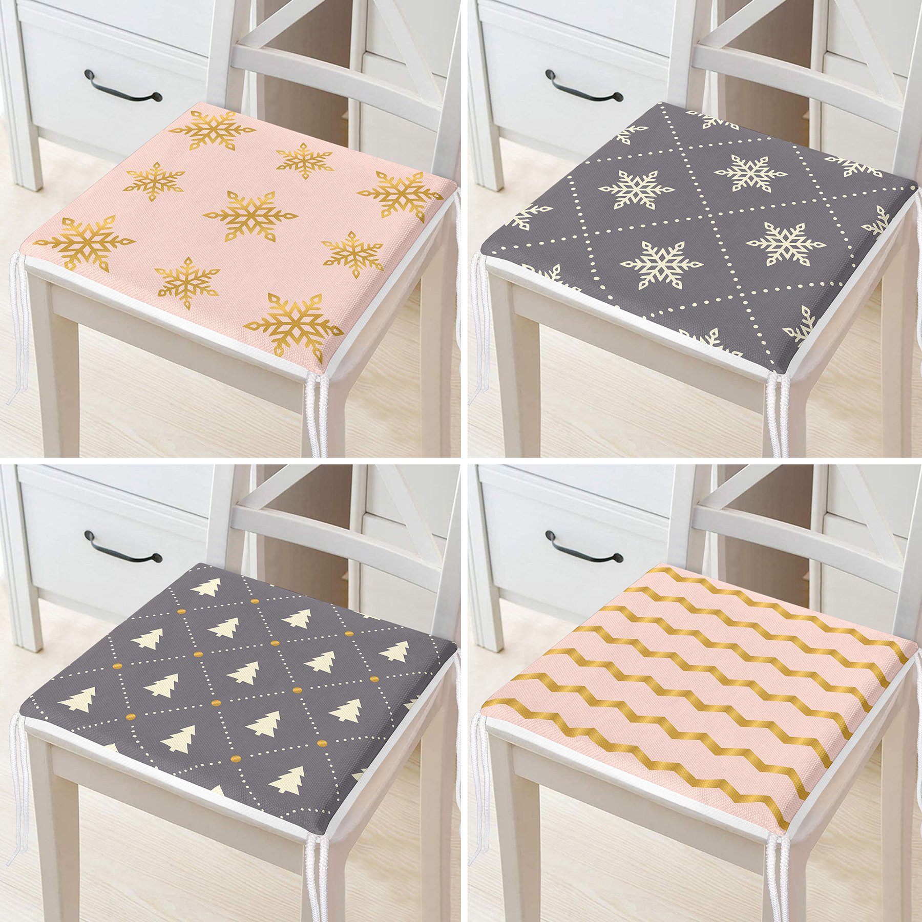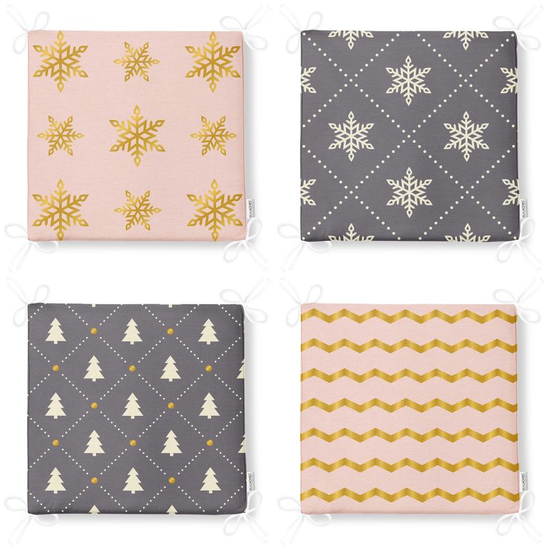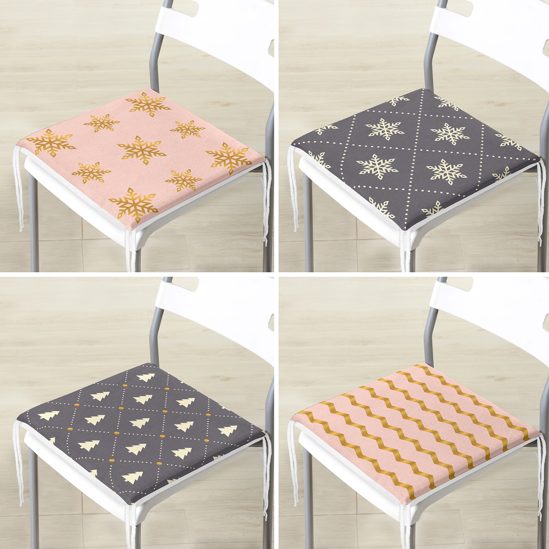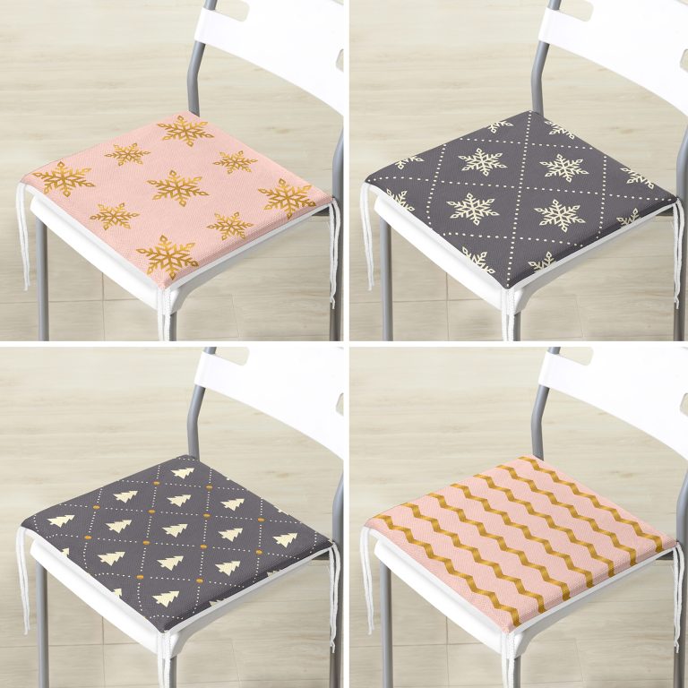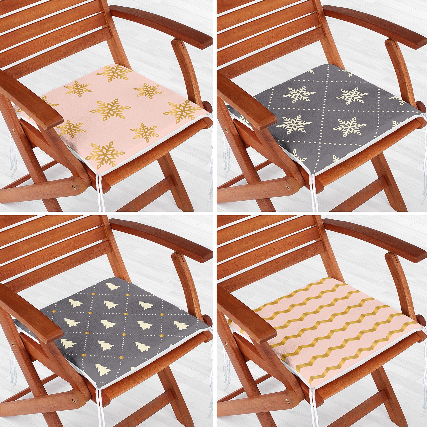 4’lü Renkli Zemin Üzerinde Gold Detaylı Yılbaşı Desenli Modern Fermuarlı Sandalye Minderi Seti