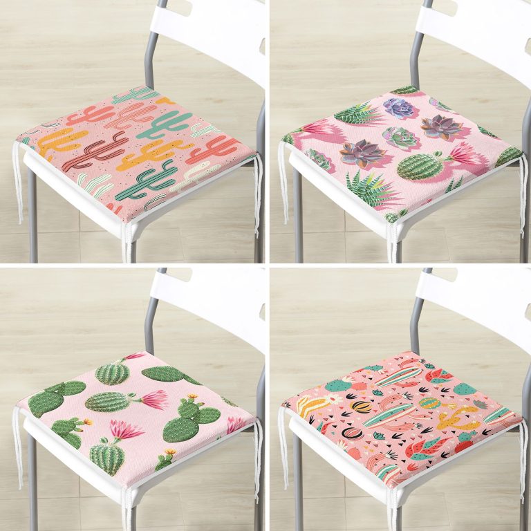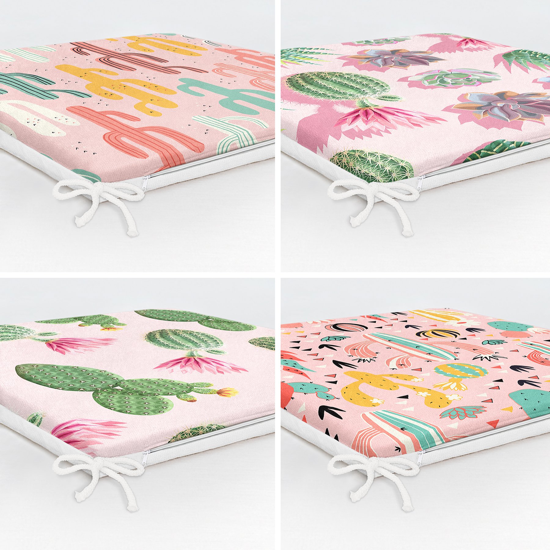 4’lü Renkli Zemin Üzerinde Kaktüs Desenli Modern Fermuarlı Sandalye Minderi Seti