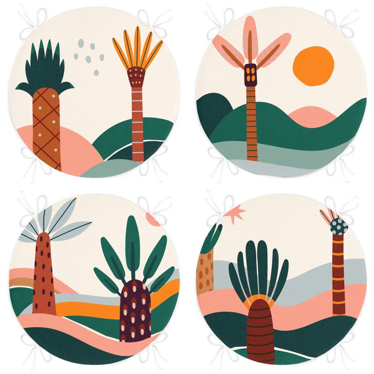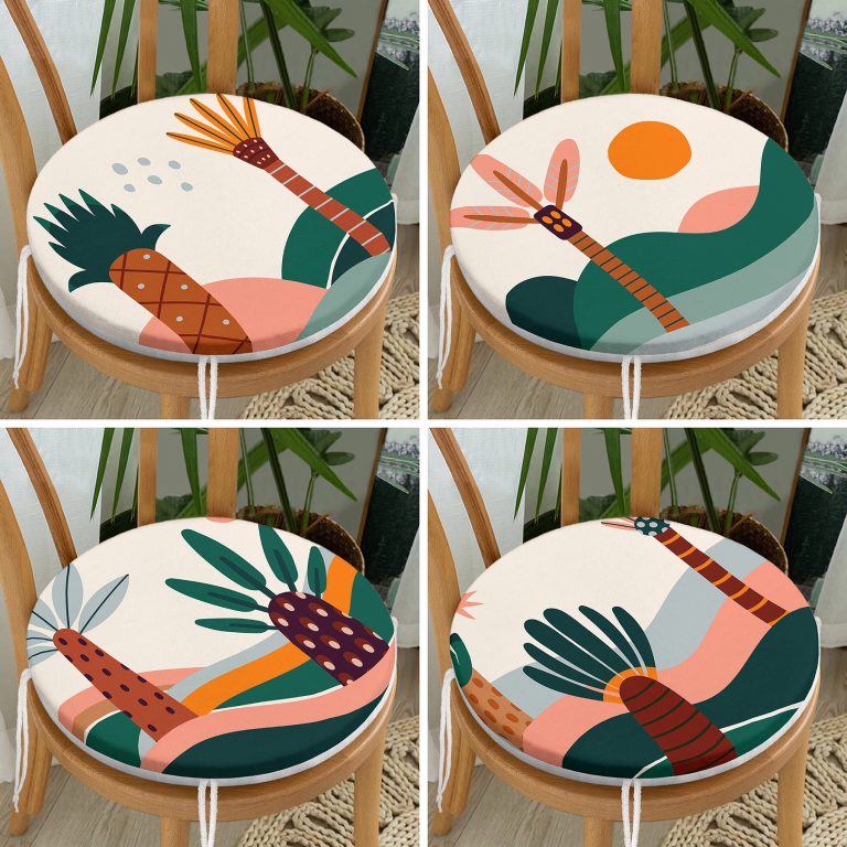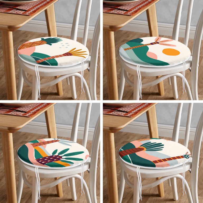 4’lü Renkli Zemin Üzerinde Onedraw Çizimli Ağaç Desenli Modern Yuvarlak Fermuarlı Sandalye Minderi Seti