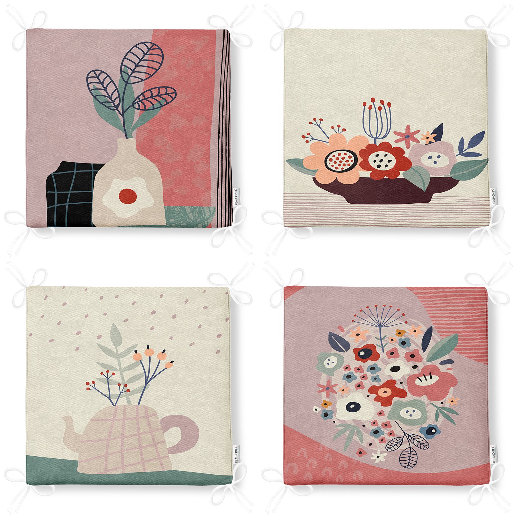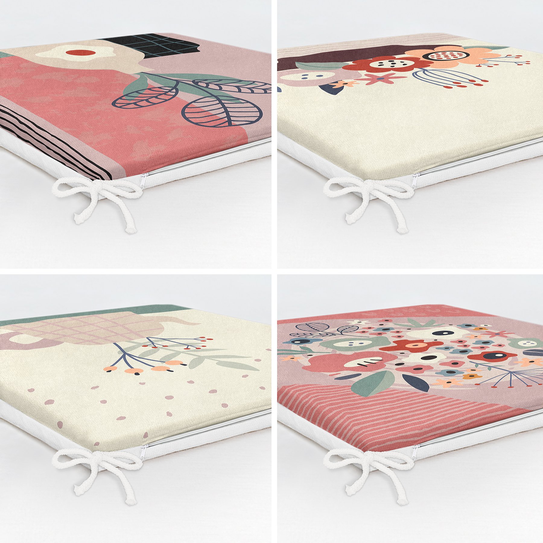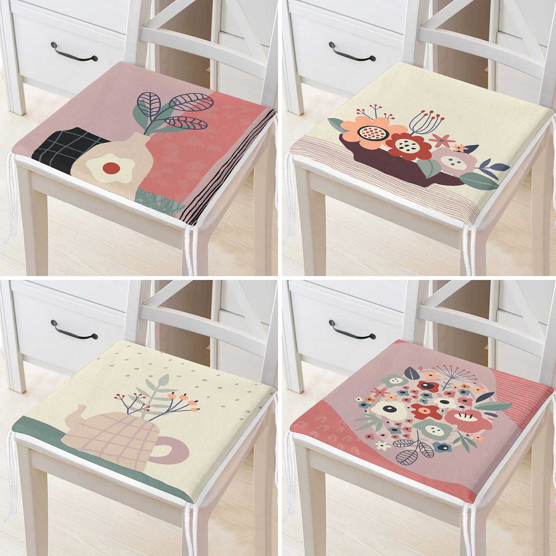 4’lü Renkli Zemin Üzerinde Onedraw Çizimli Vazo Desenli Modern Fermuarlı Sandalye Minderi Seti