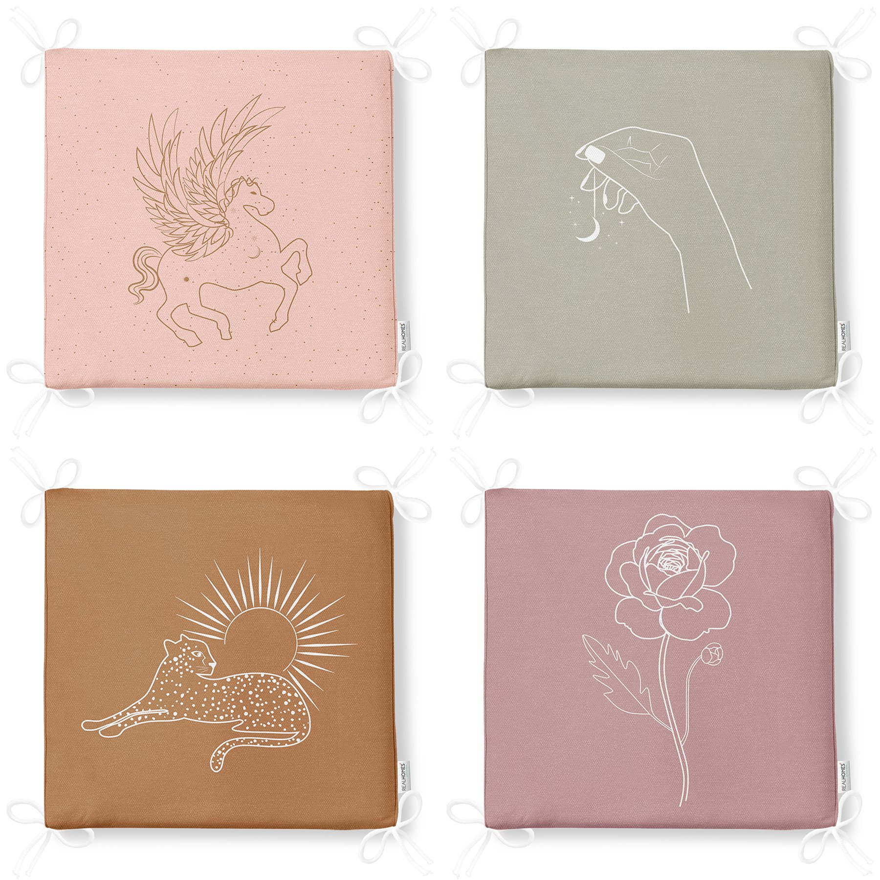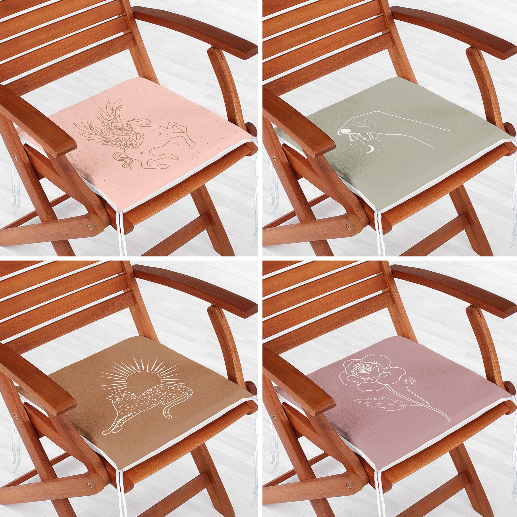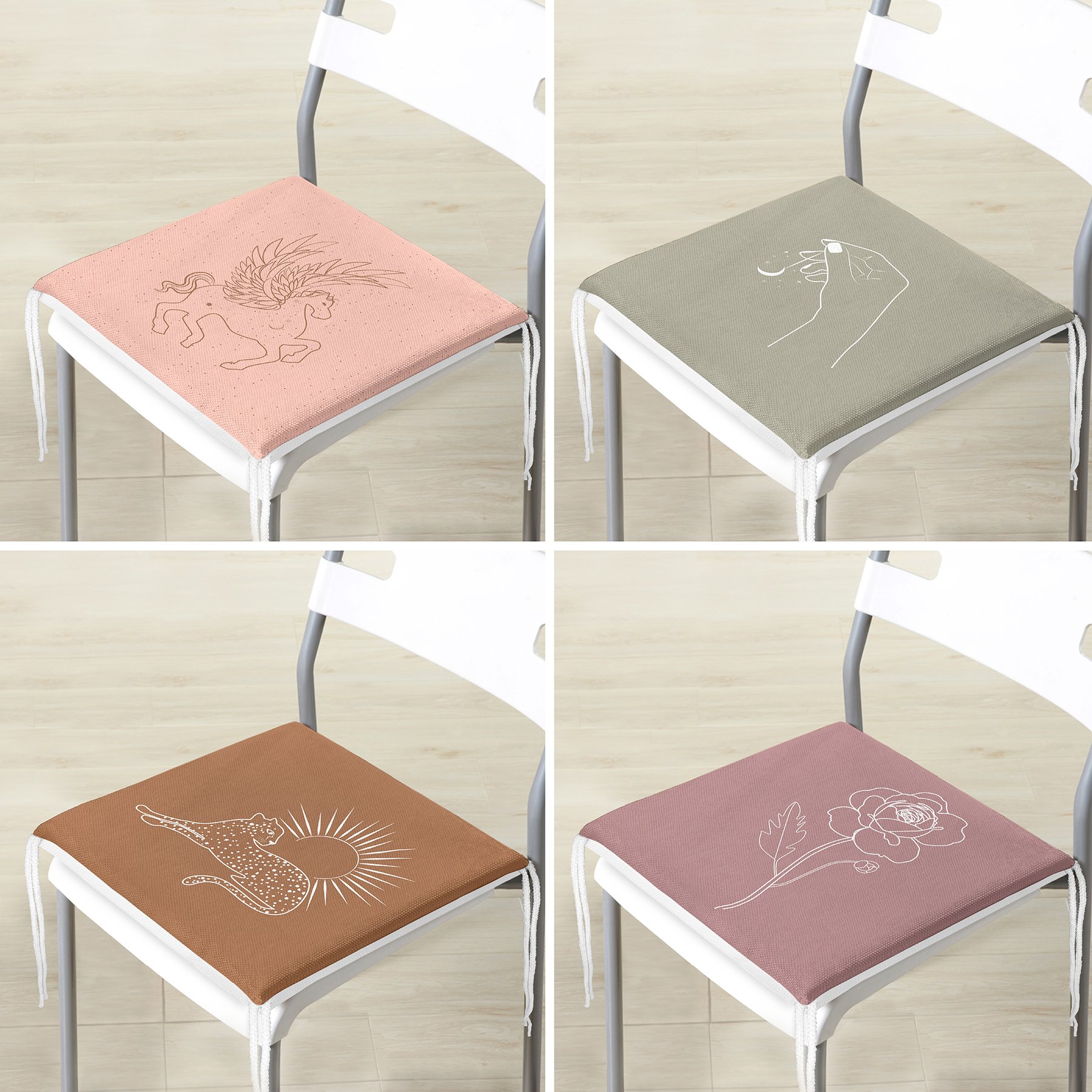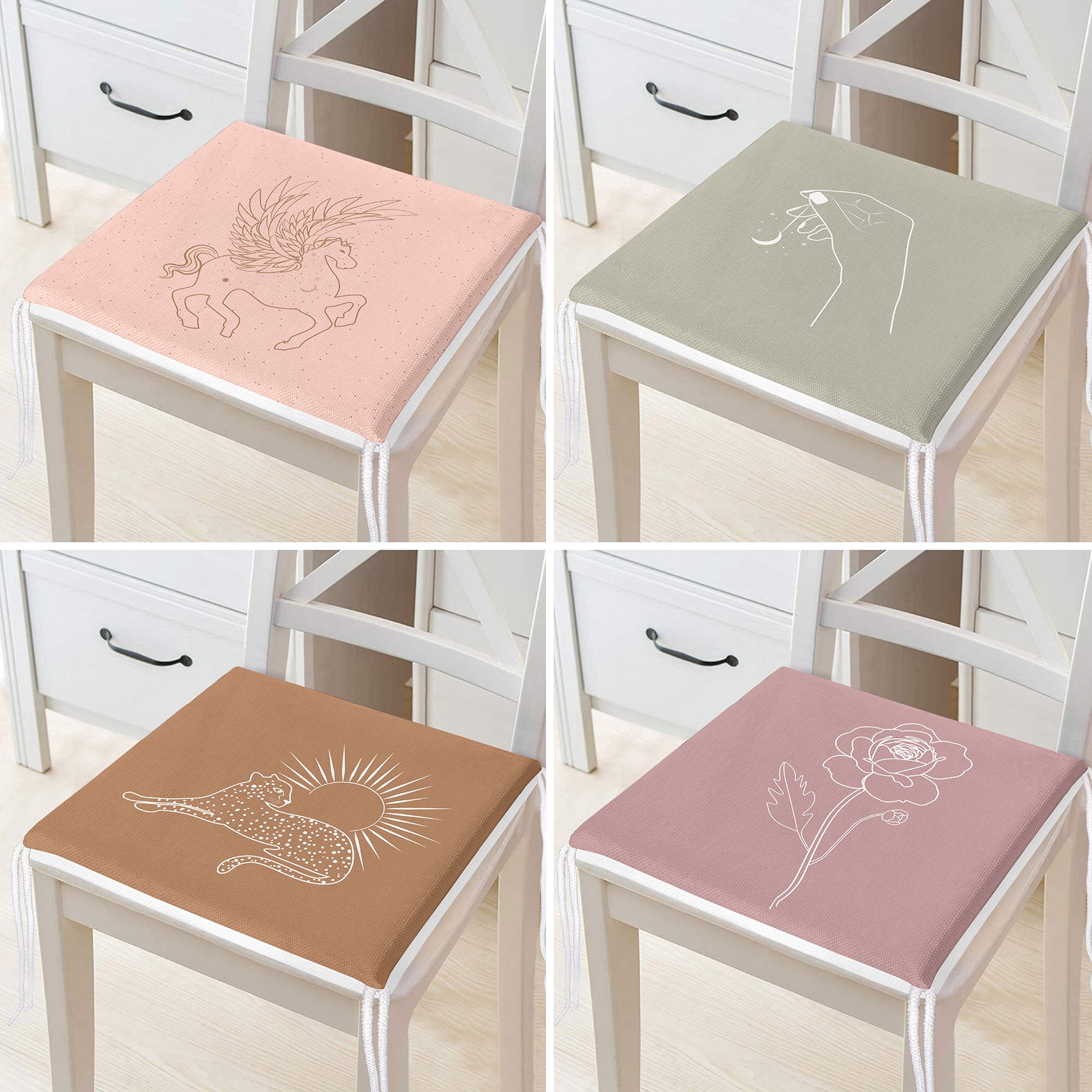 4’lü Renkli Zemin Üzerinde Onedraw Çizimli Yaprak Desenli Modern Fermuarlı Sandalye Minderi Seti