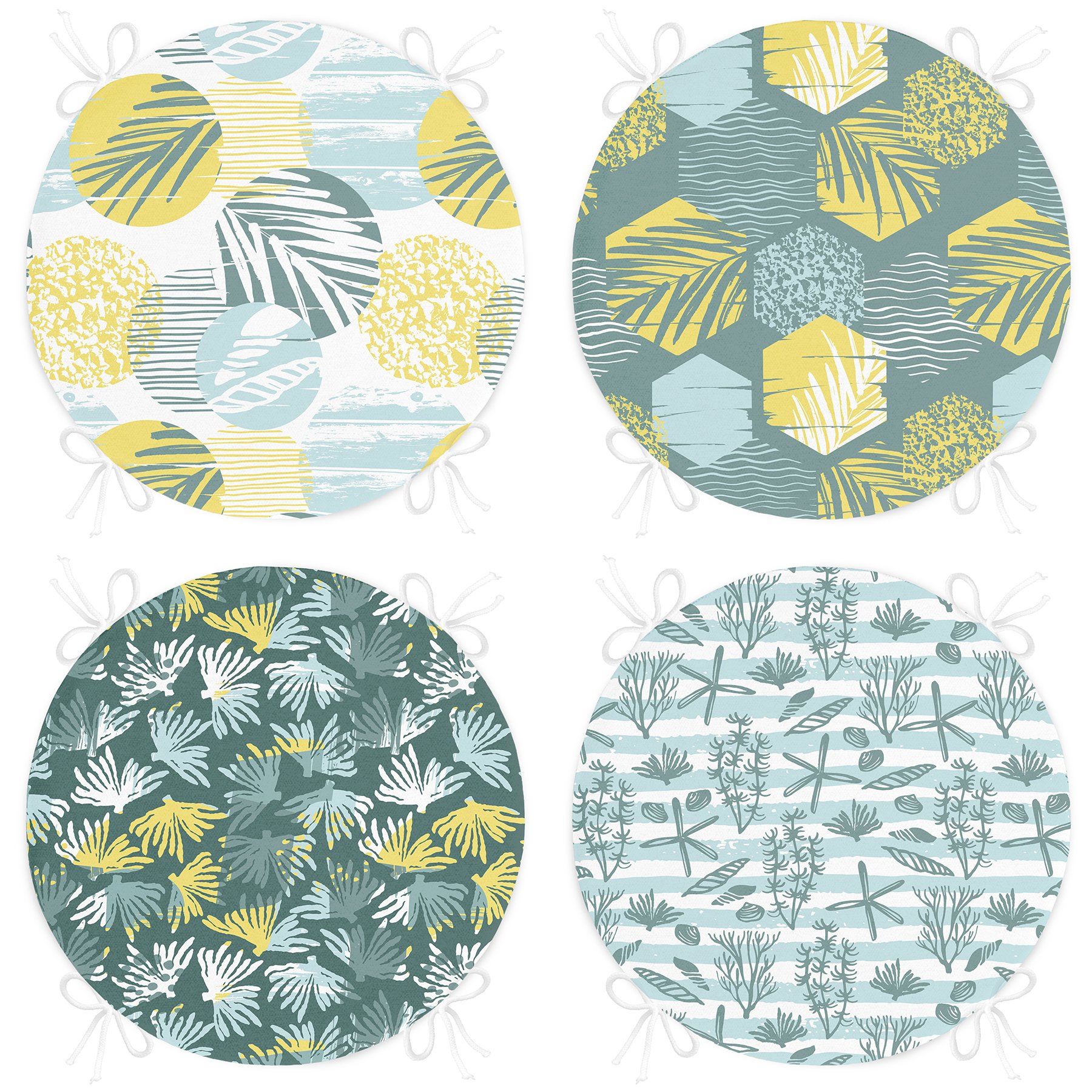 4’lü Renkli Zemin Üzerinde Yaprak Desenli Modern Yuvarlak Fermuarlı Sandalye Minderi Seti