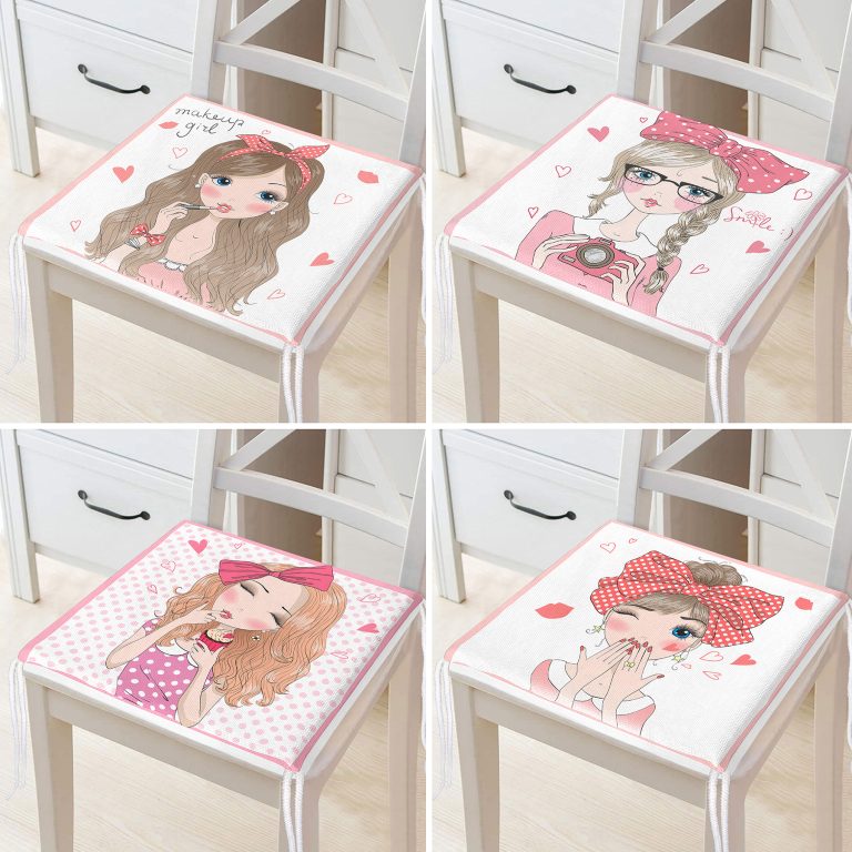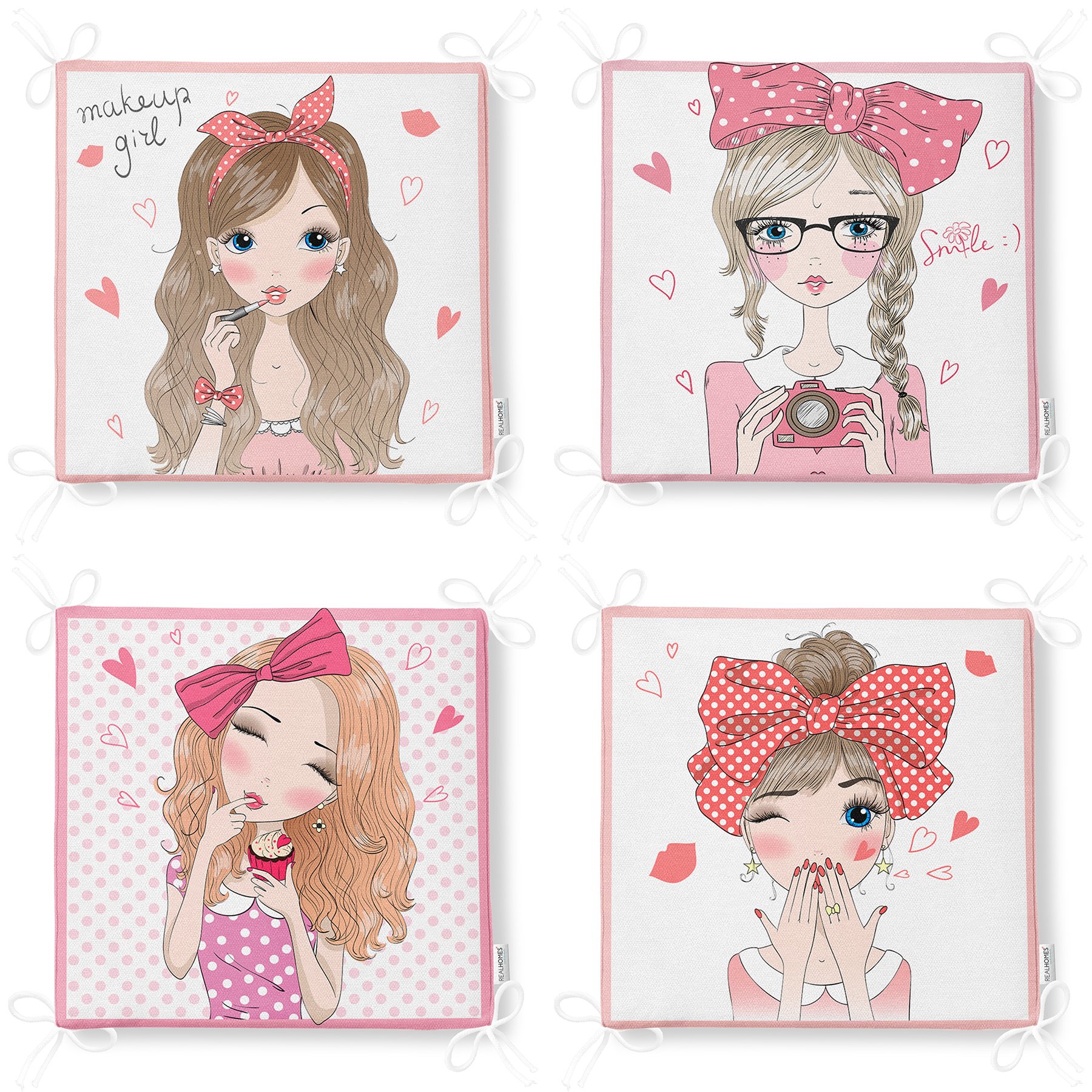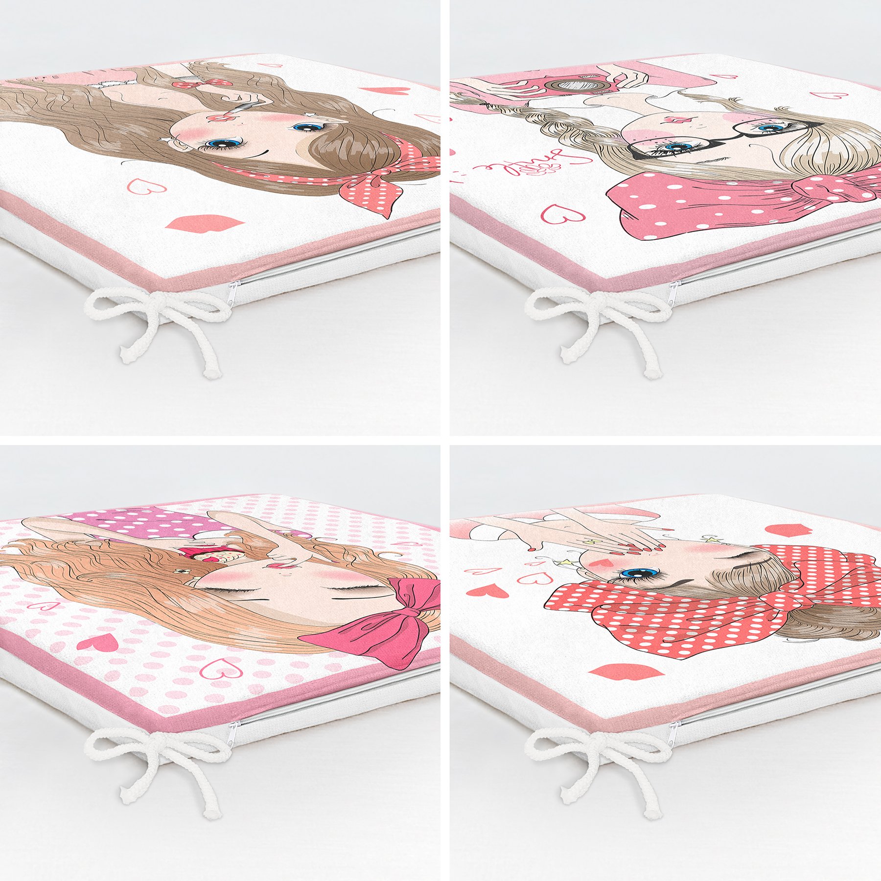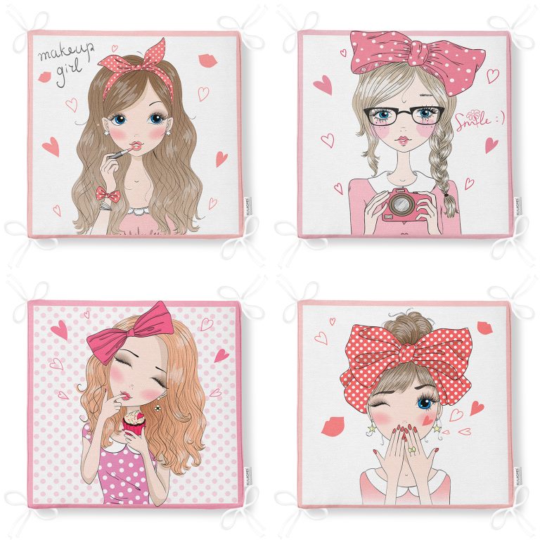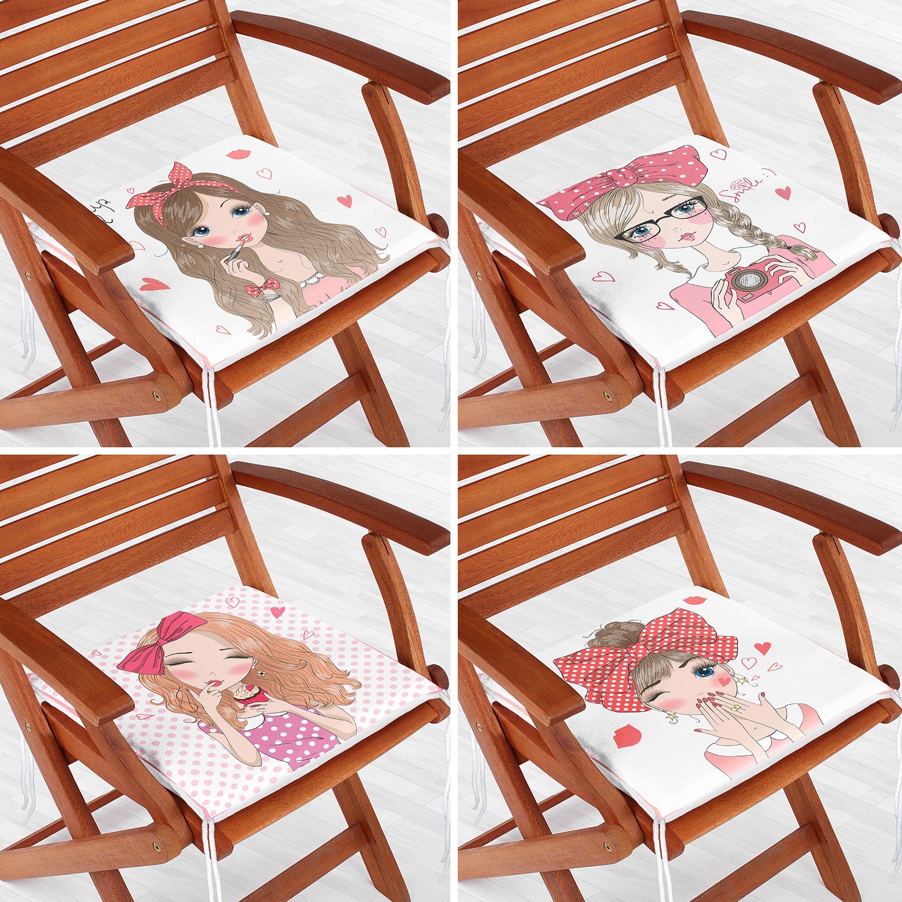 4’lü Sevimli Kız Portreli Özel Tasarım Fermuarlı Sandalye Minderi Seti