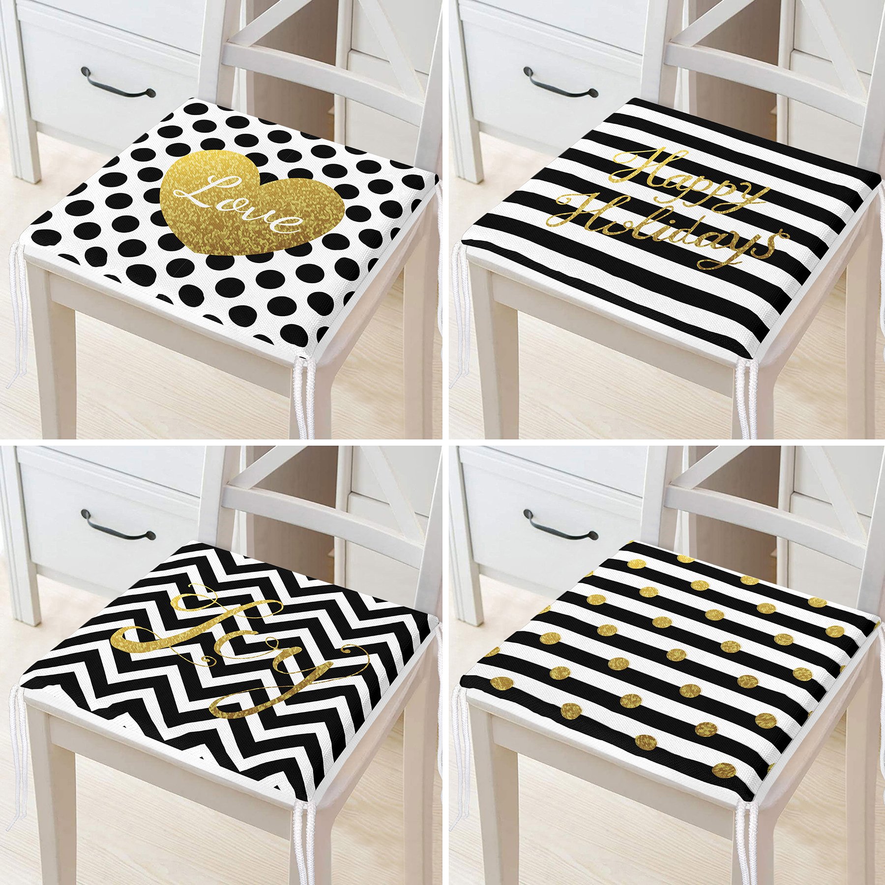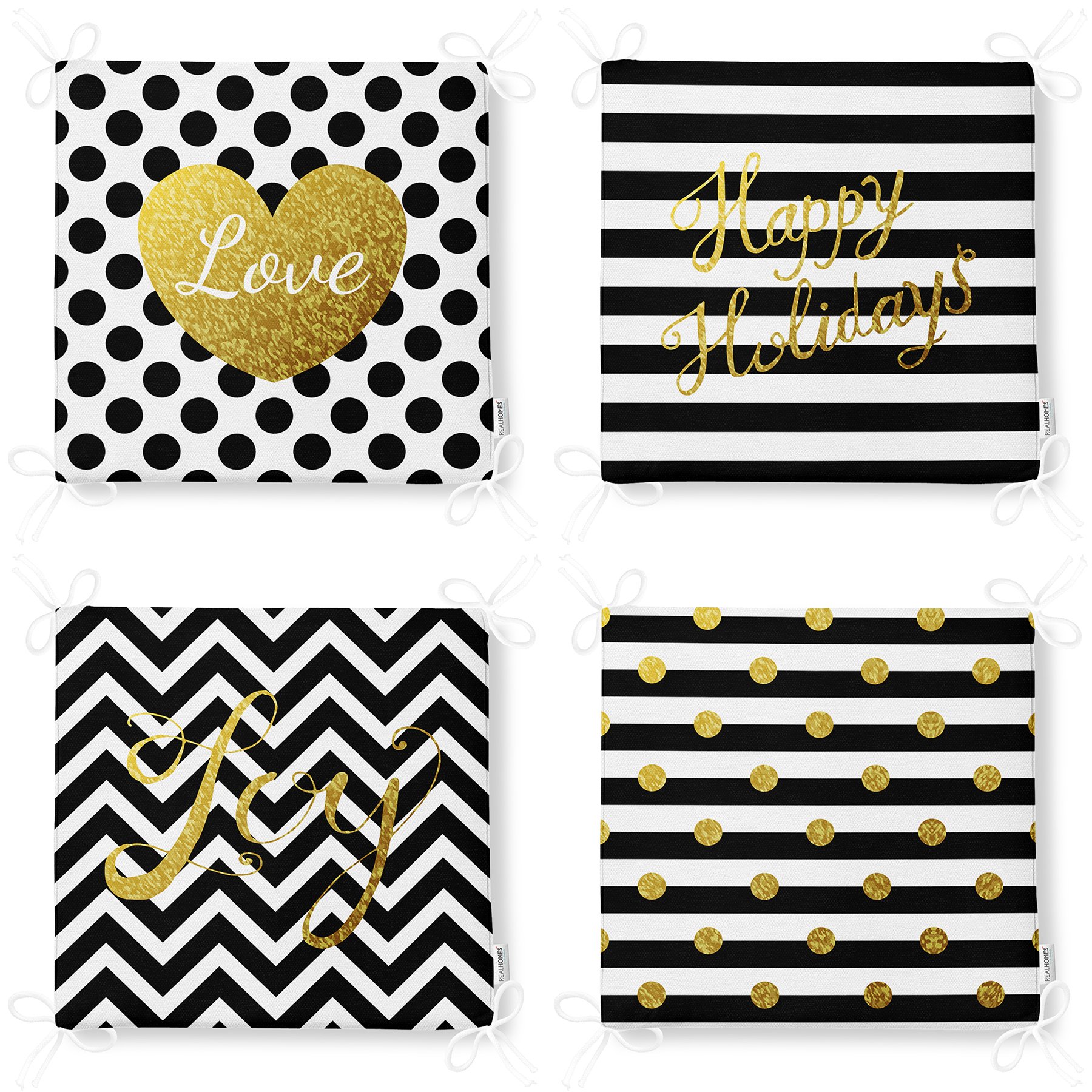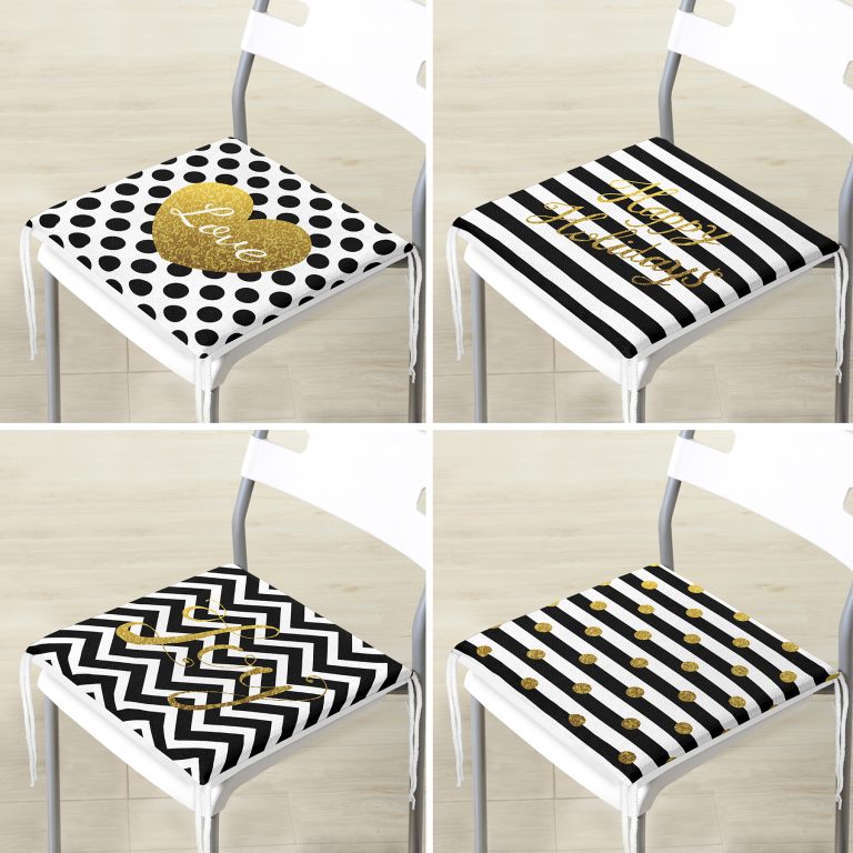 4’lü Siyah Beyaz Altın Varaklı Motifler Dijital Baskılı Fermuarlı Sandalye Minderi Seti