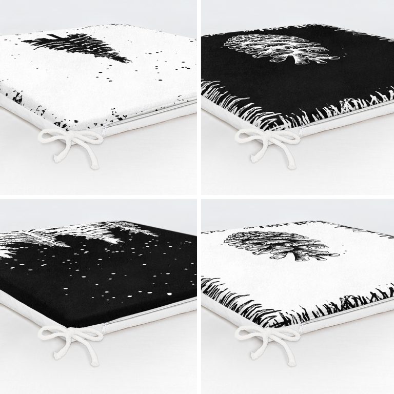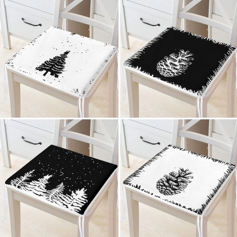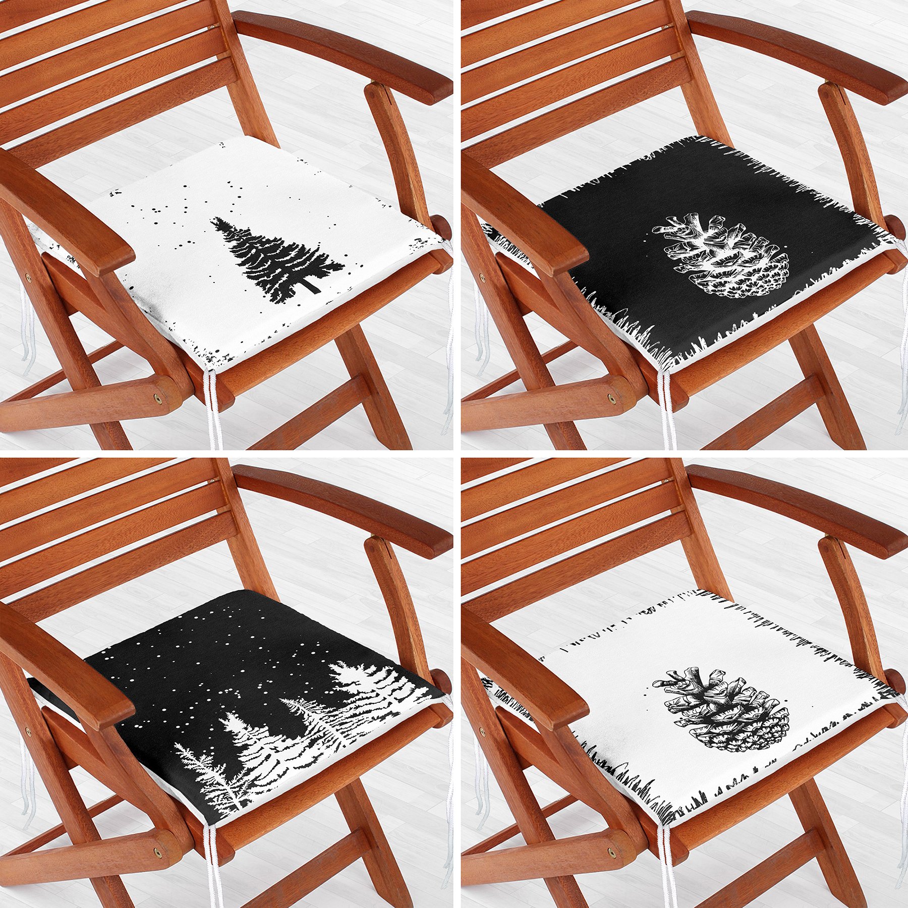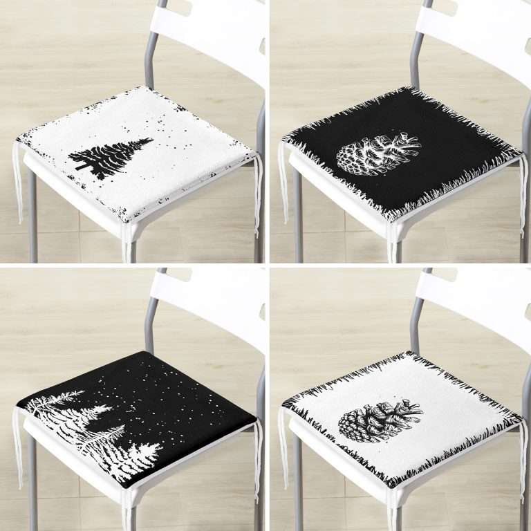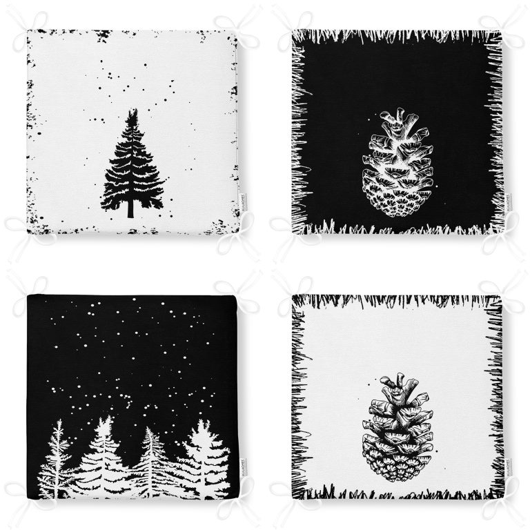 4’lü Siyah Beyaz Çam Ağacı & Kozalak Tasarımlı Dijital Baskılı Modern Fermuarlı Sandalye Minderi Seti