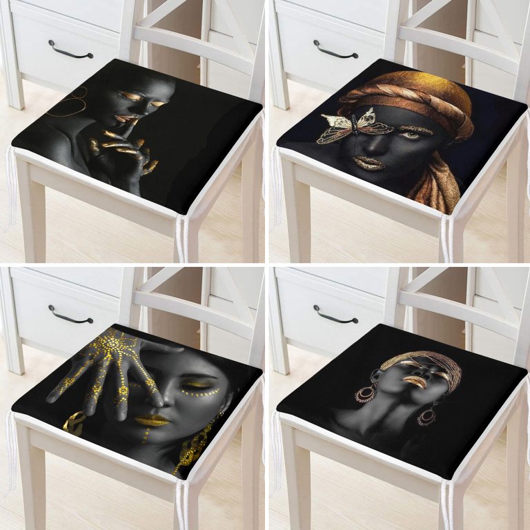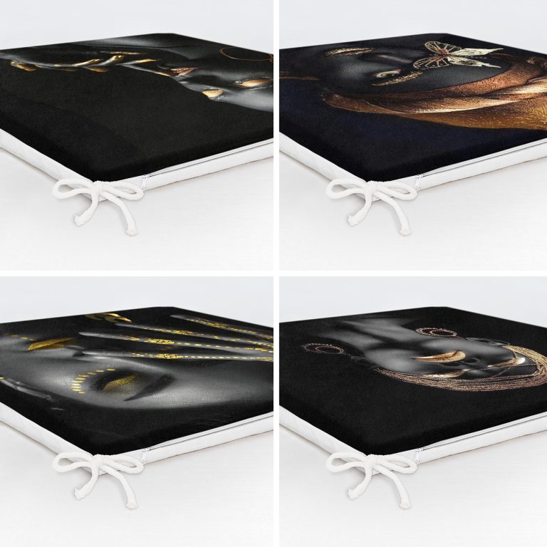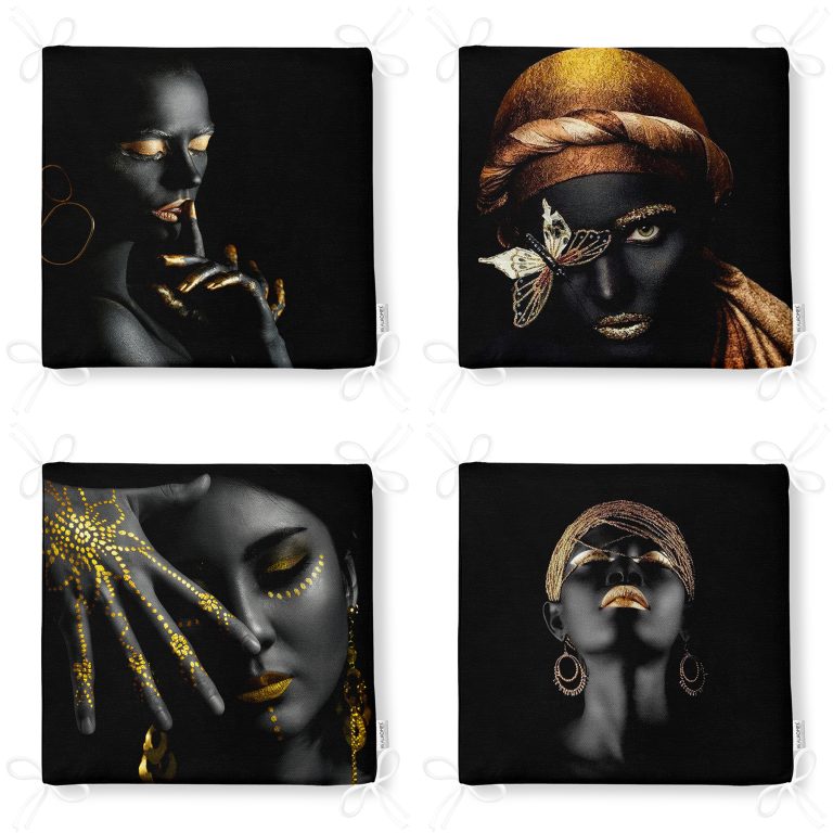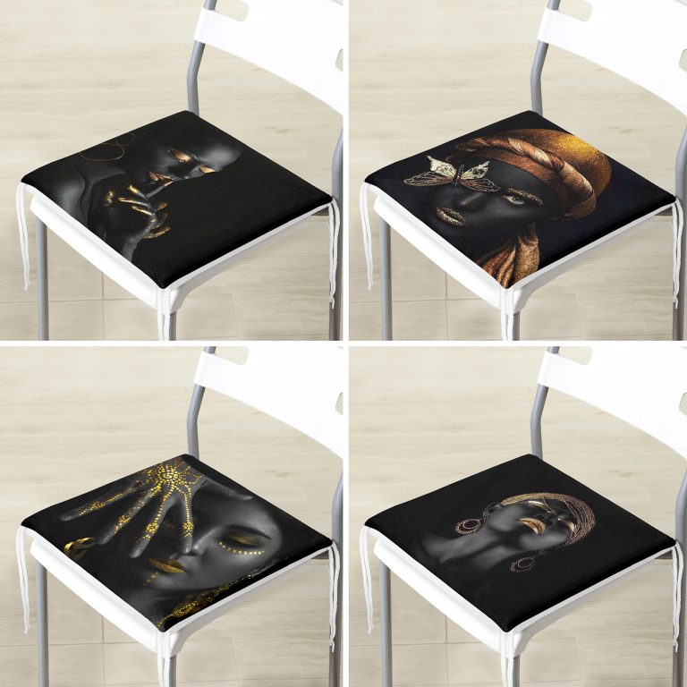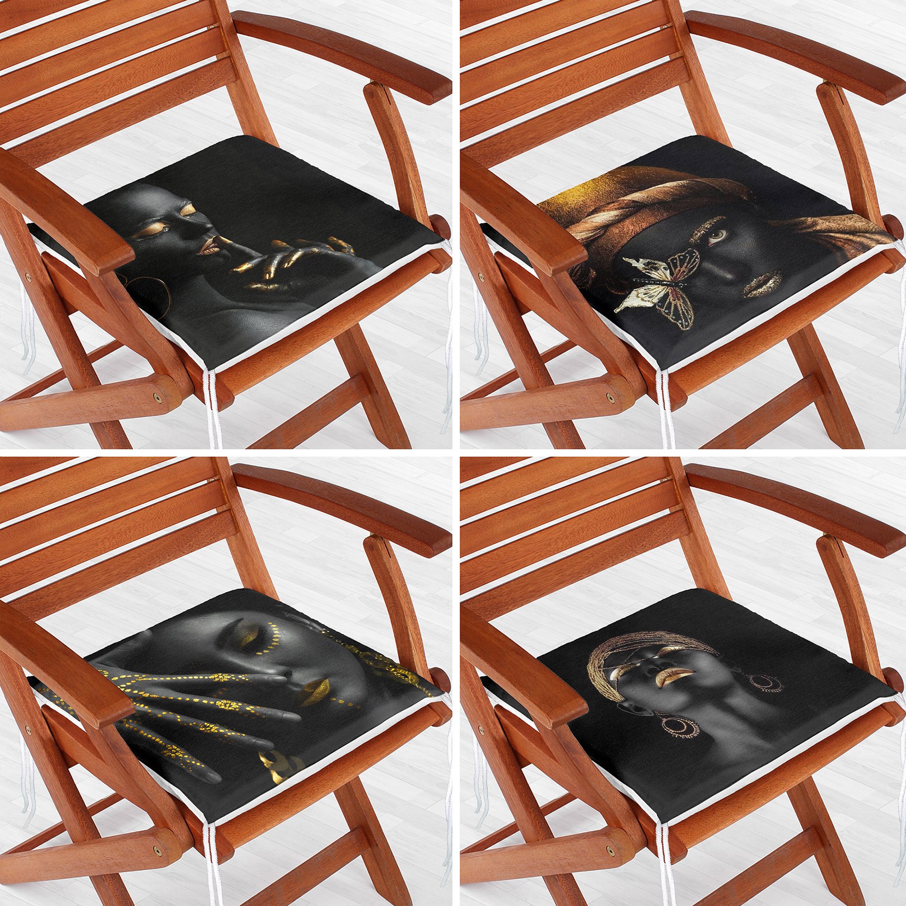 4’lü Siyah Zeminli Afrika Bayan Temalı Fermuarlı Sandalye Minderi Seti