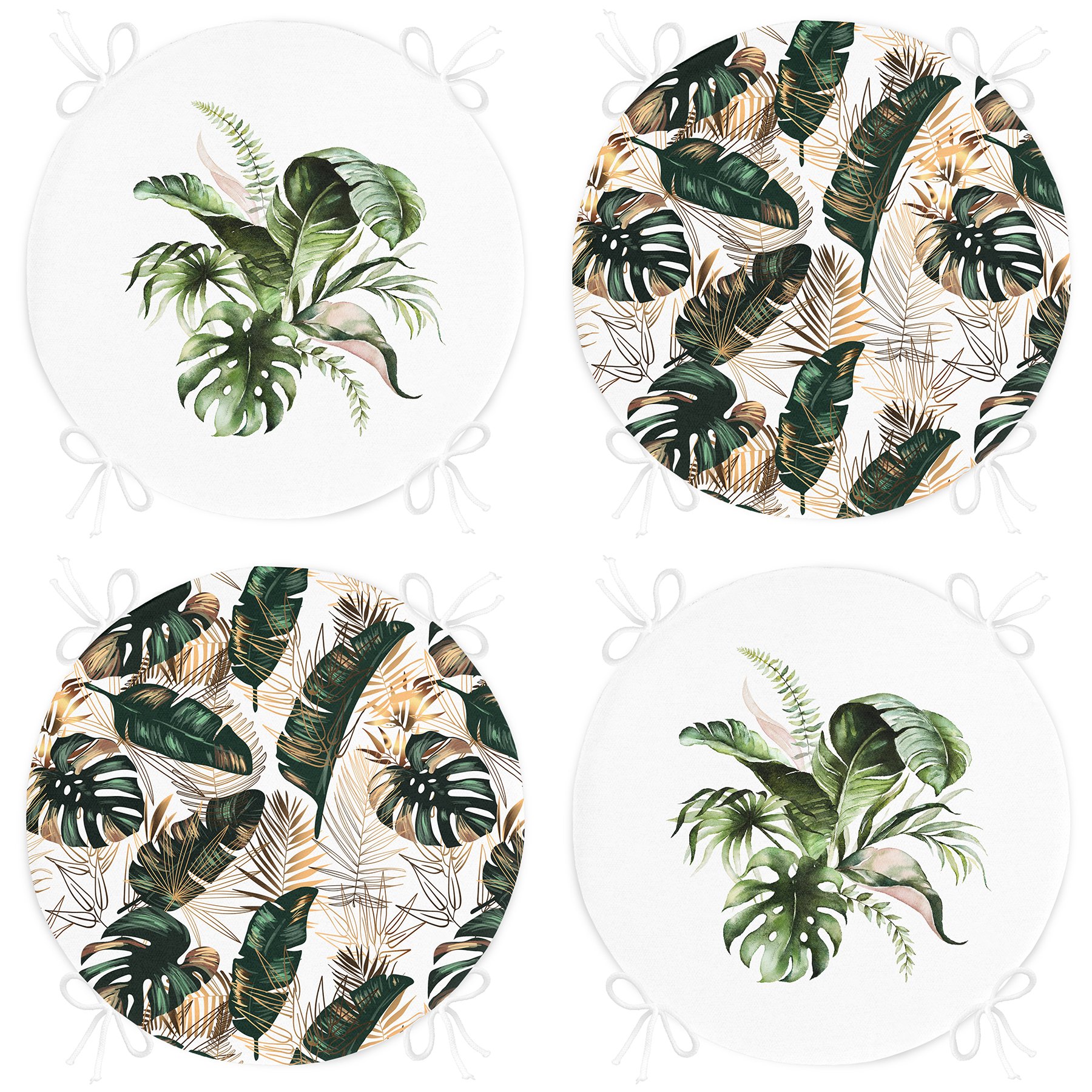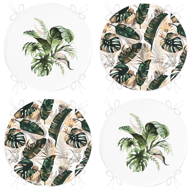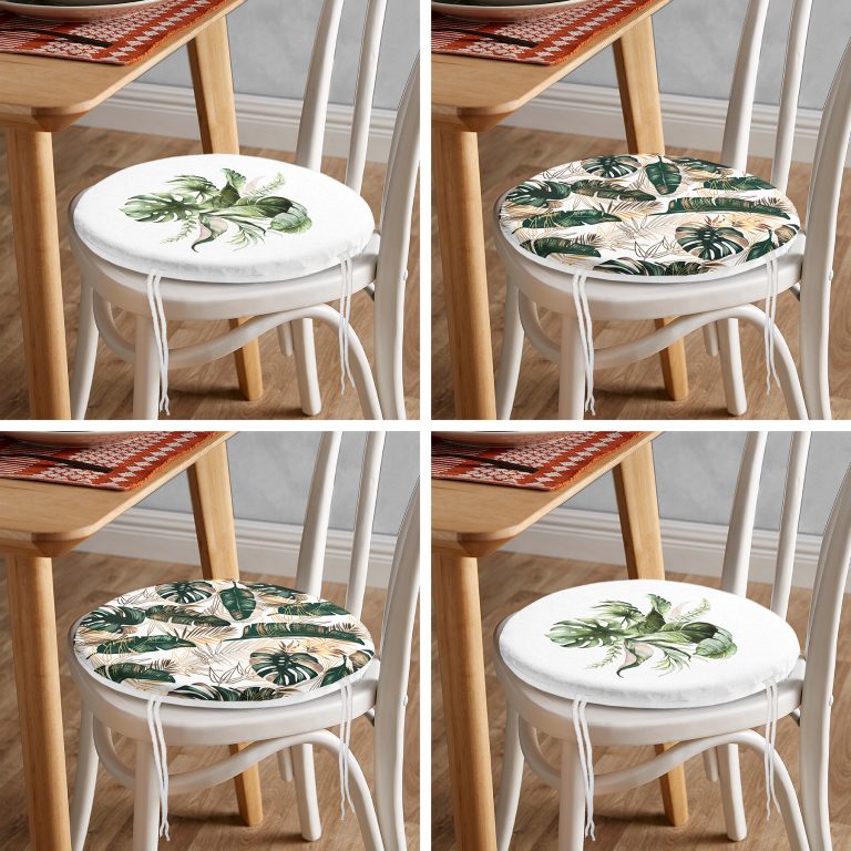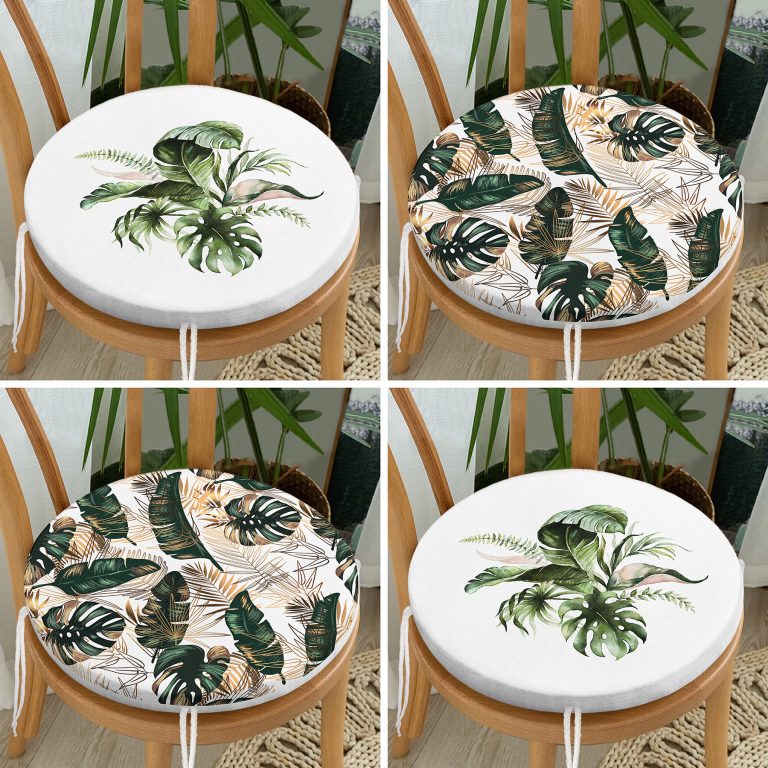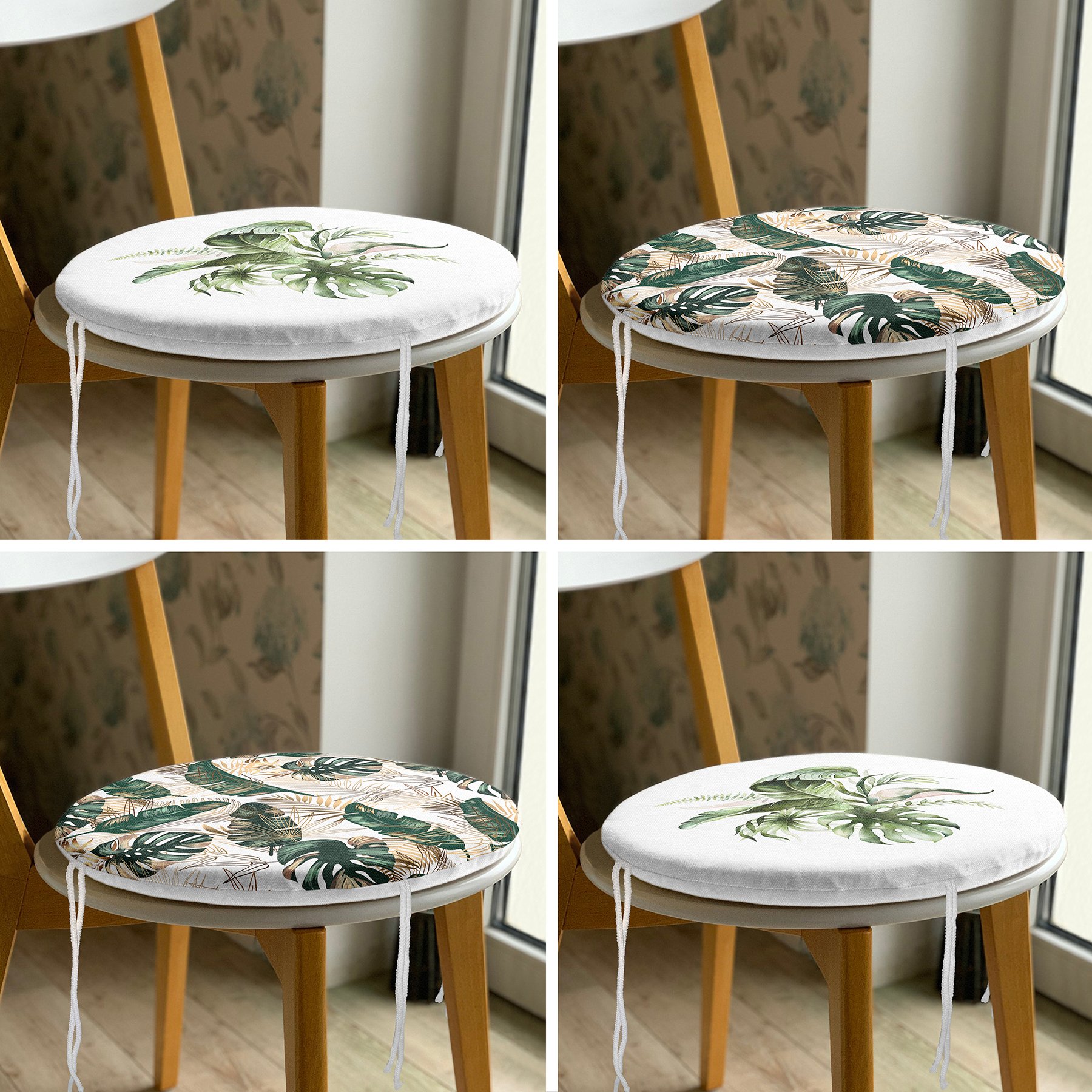 4’lü Tropik Yaprak Özel Tasarımlı Dijital Baskılı Modern Yuvarlak Fermuarlı Sandalye Minderi Seti