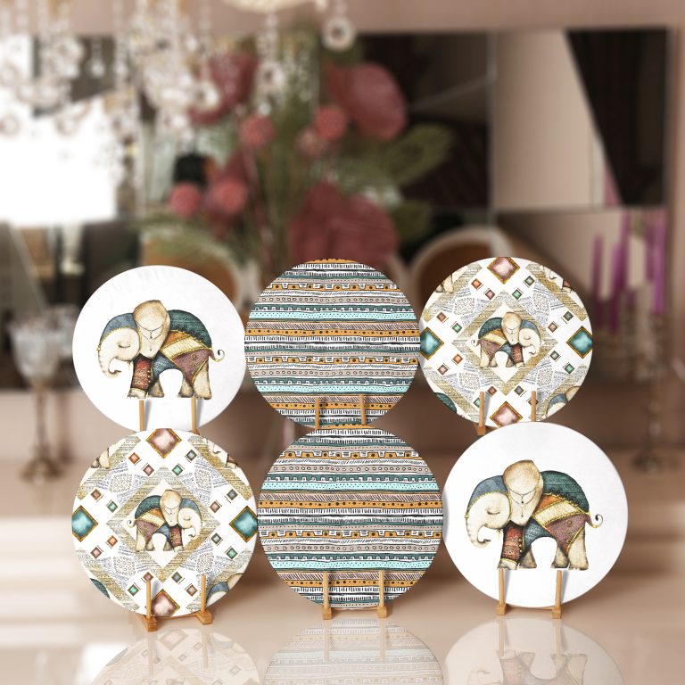 6’lı Etnik İskandinav Motifli Fil Tasarımlı Modern Yuvarlak Servis Altlığı & Supla