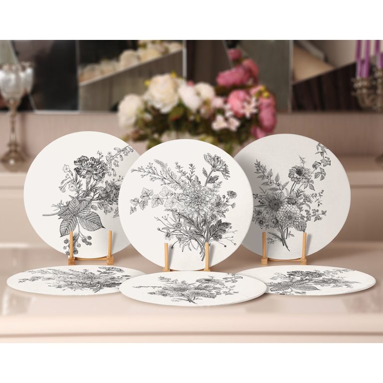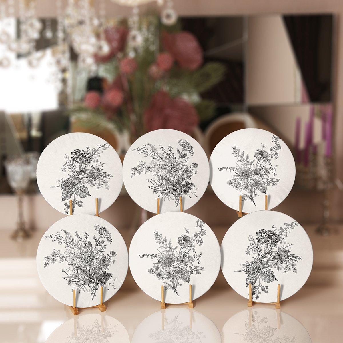 6’lı Krem Zeminli Karakalem Çiçek Demeti Tasarımlı Servis Altlığı & Supla