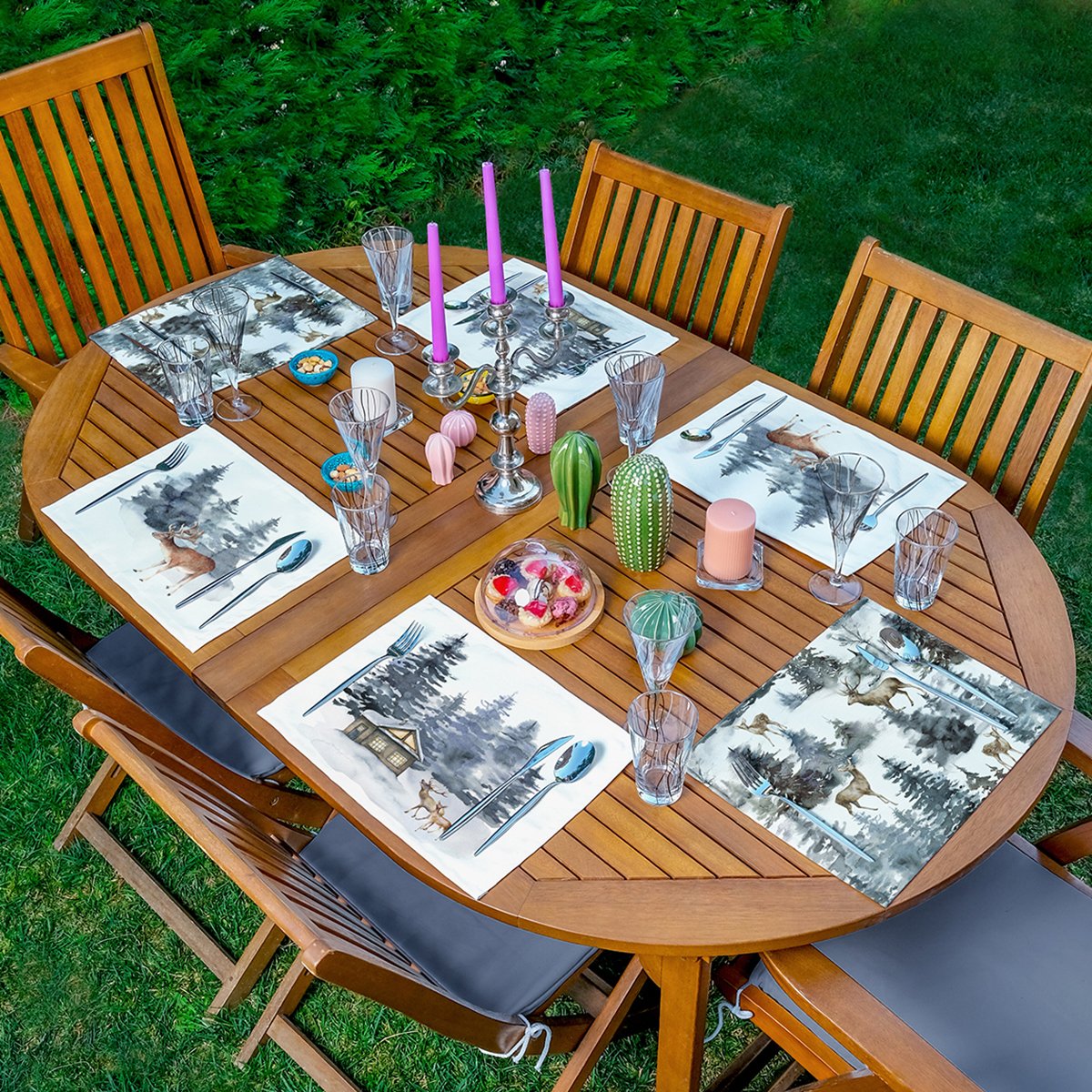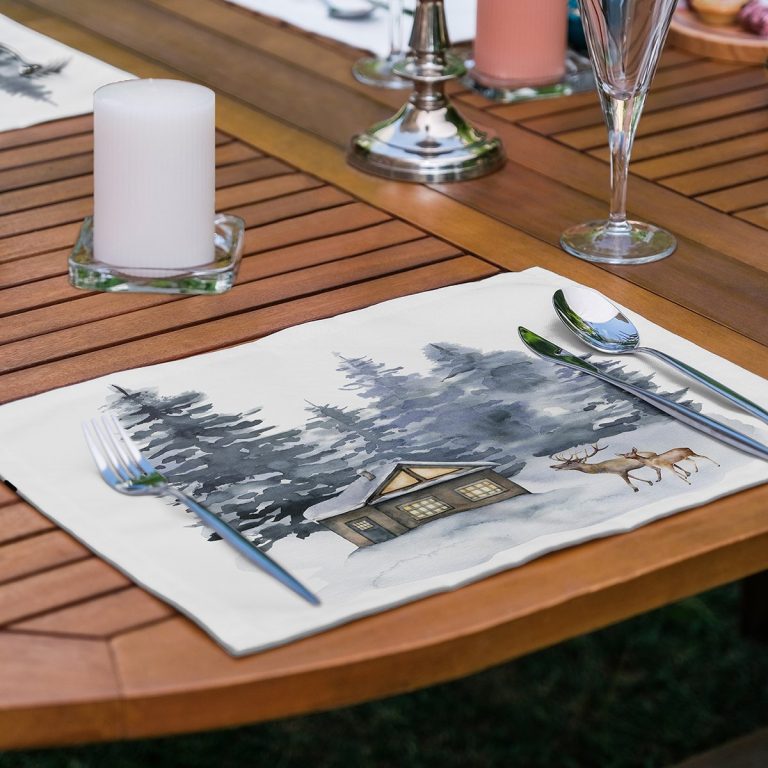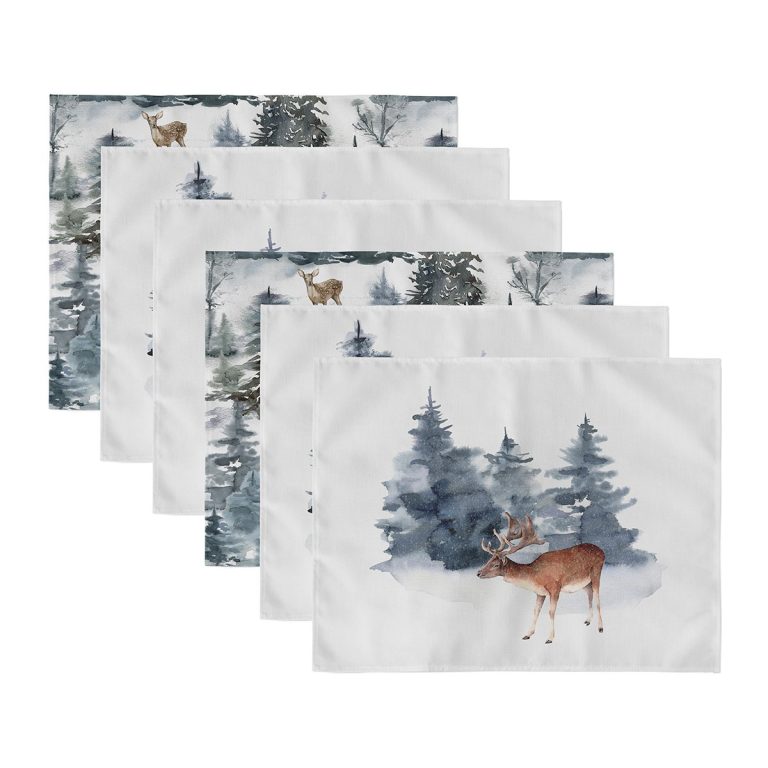 6’lı Özel Tasarım Geyikler & Çam Ağacı Motifli Amerikan Servis Seti