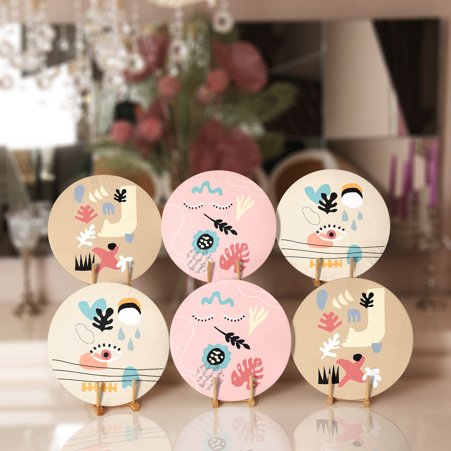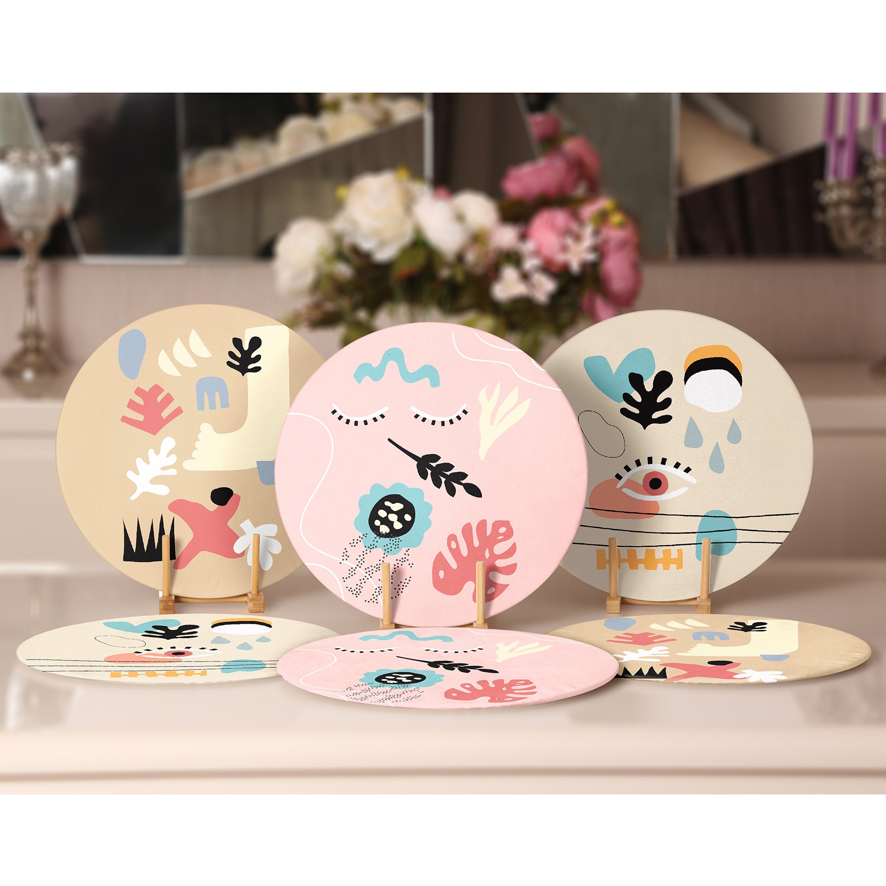 6’lı Renkli Çiçek Tasarımlı Onedraw Temalı Dekoratif Yuvarlak Servis Altlığı & Supla