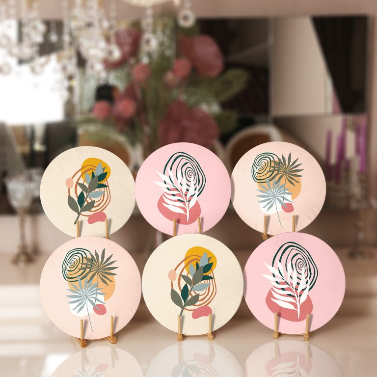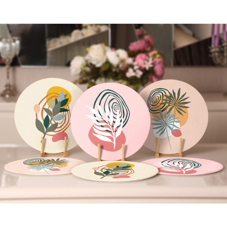 6’lı Tropik Yapraklar Onedraw Temalı Dijital Baskılı Dekoratif Yuvarlak Servis Altlığı & Supla