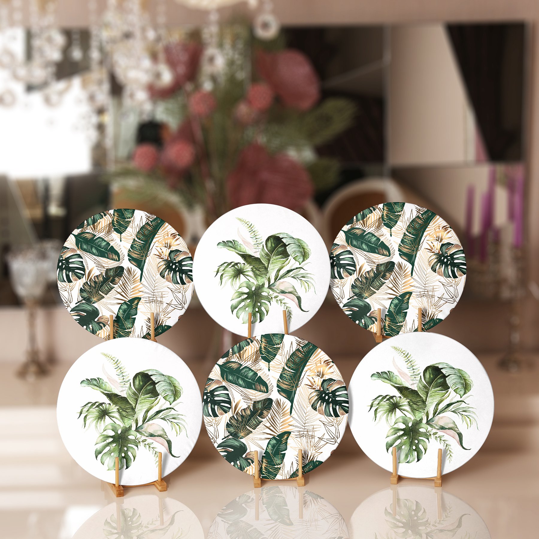 6’lı Yeşil Tropik Yaprak Özel Tasarımlı Dijital Baskılı Yuvarlak Servis Altlığı & Supla