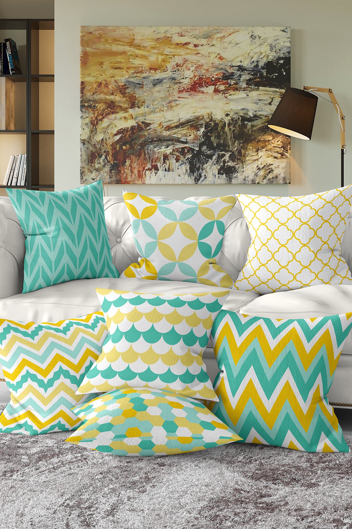 7’li Renkli Geometrik Çizimli Dijital Baskılı Kırlent Kılıfı Seti