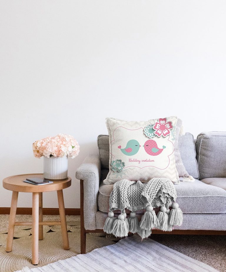 Açık Gri Zigzag Temalı Kuş Motifli Dekoratif Raşel Yastık Kırlent Kılıfı