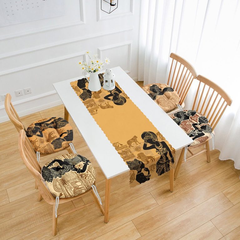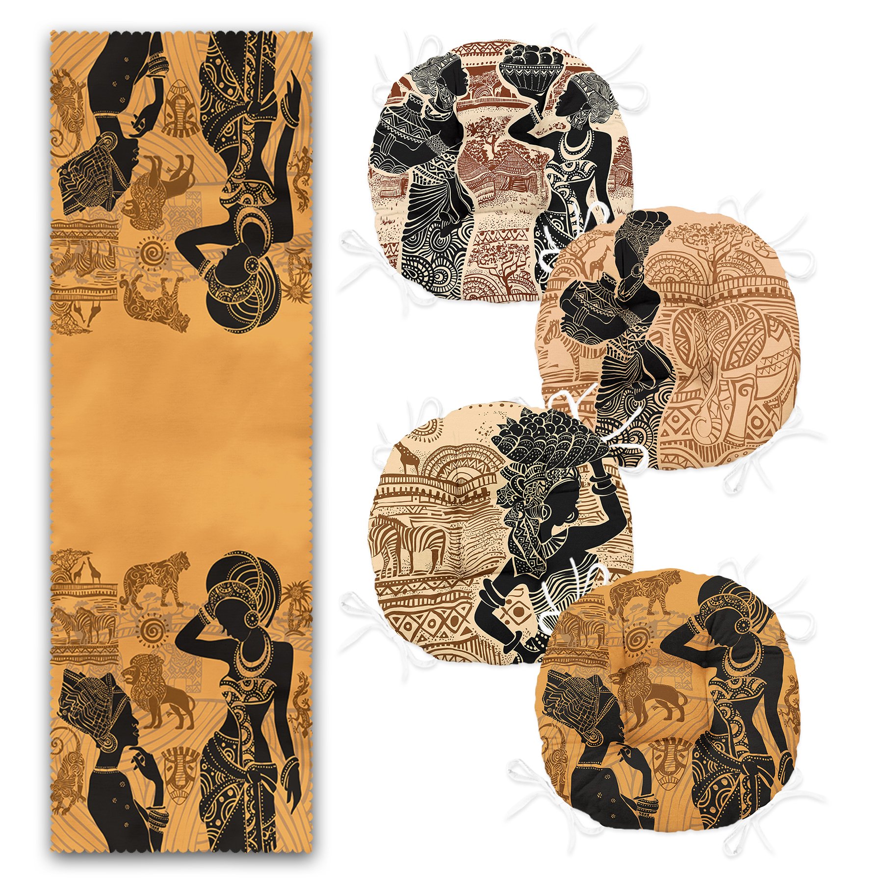 African Women Girl Motifli 4 Yuvarlak Pofidik Sandalye Minderi ve 1 Runner Seti