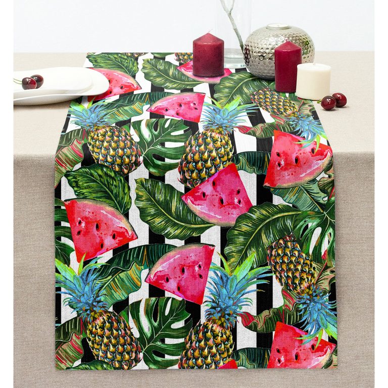 Ananas Karpuz Motifli Tropik Yaprak Tasarımlı Dikişli Şönil Runner