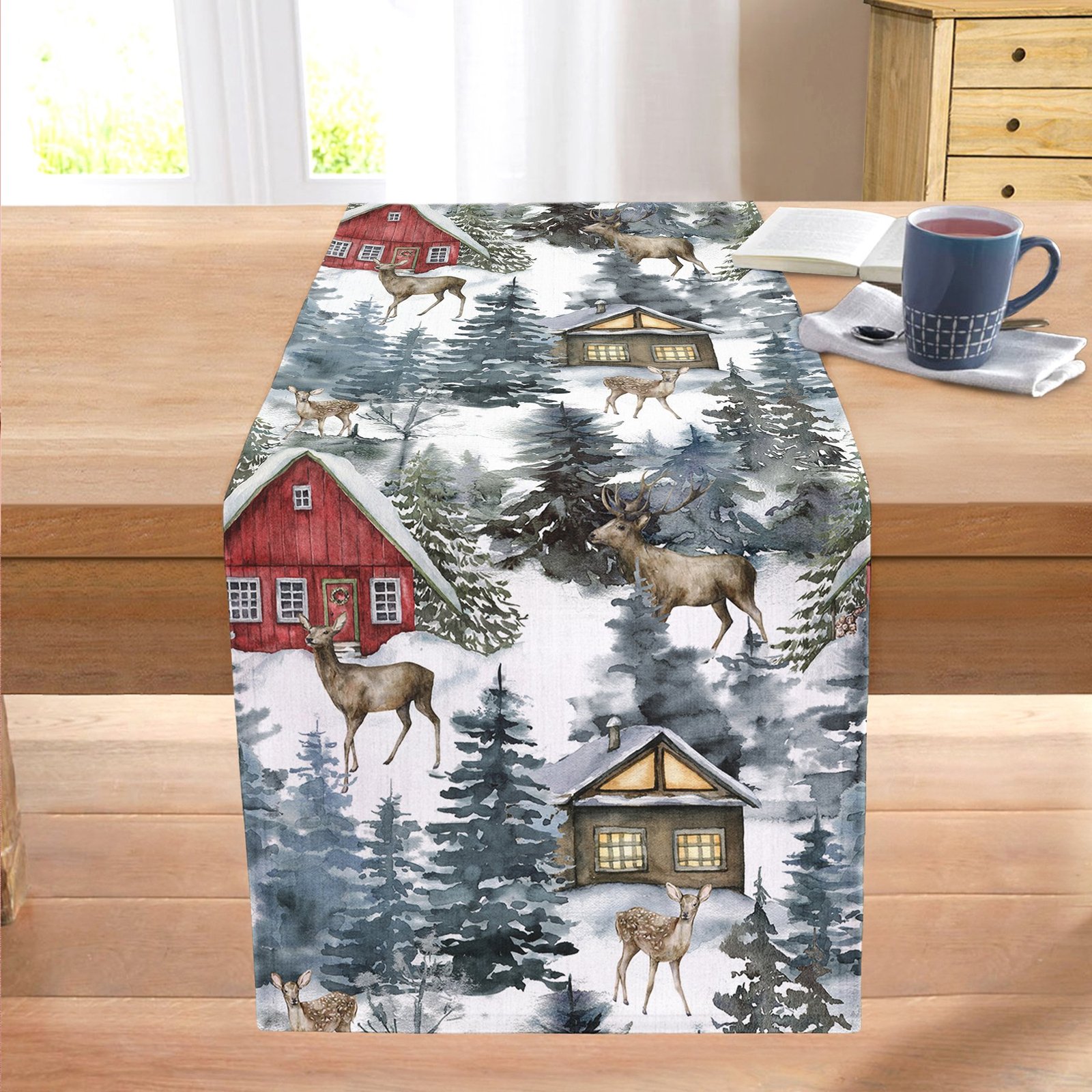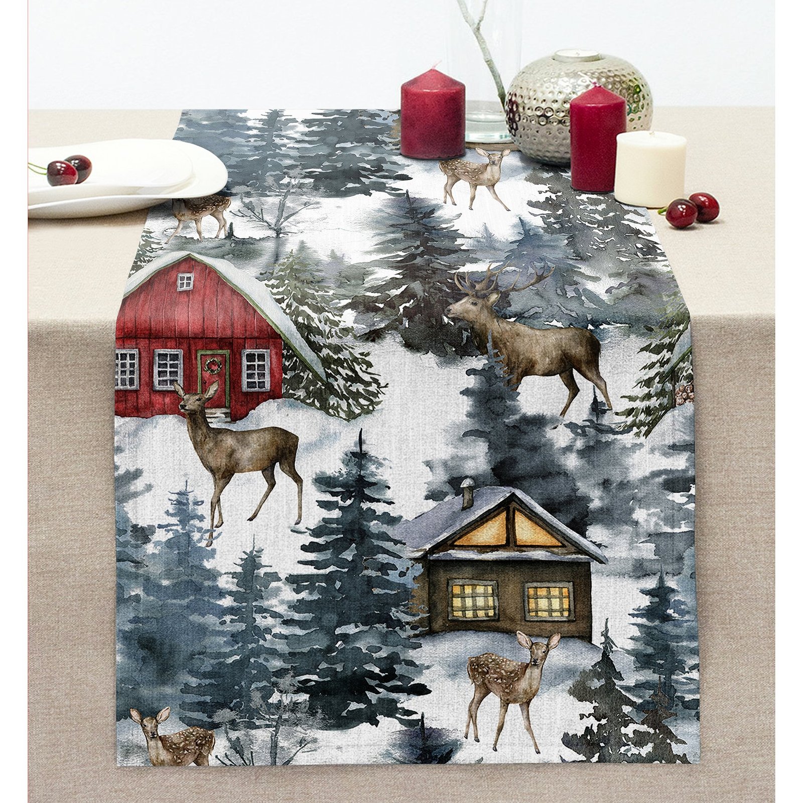 Bağ Evi Tasarımlı Kış Temalı Dijital Baskılı Dekoratif Dikişli Şönil Runner