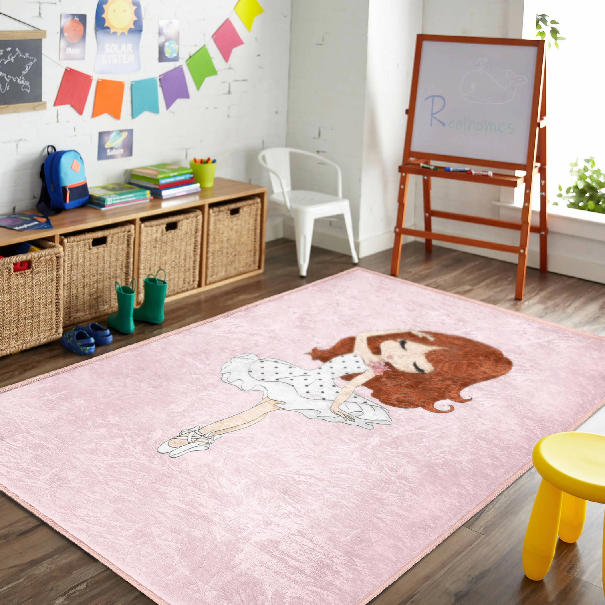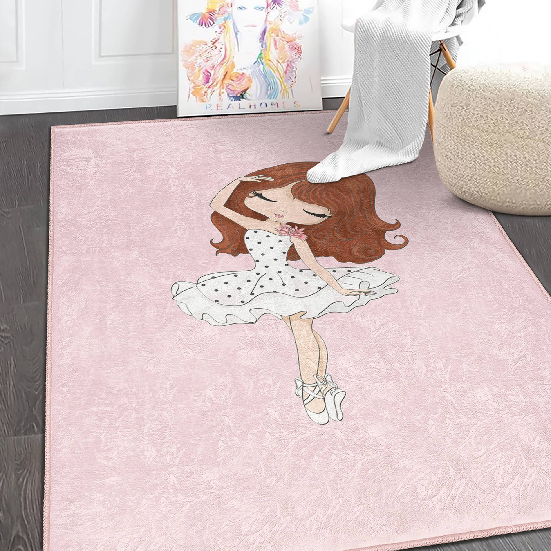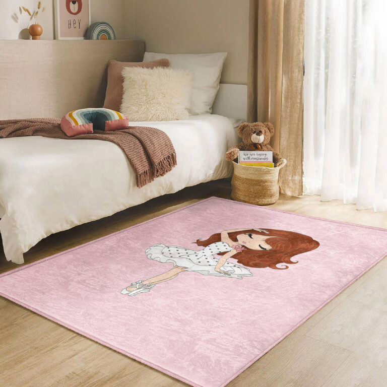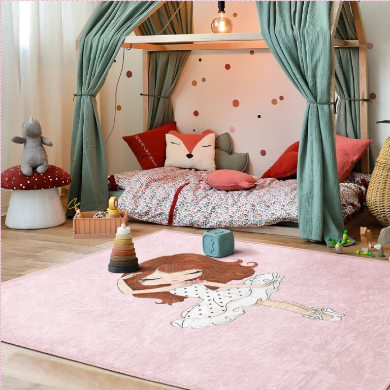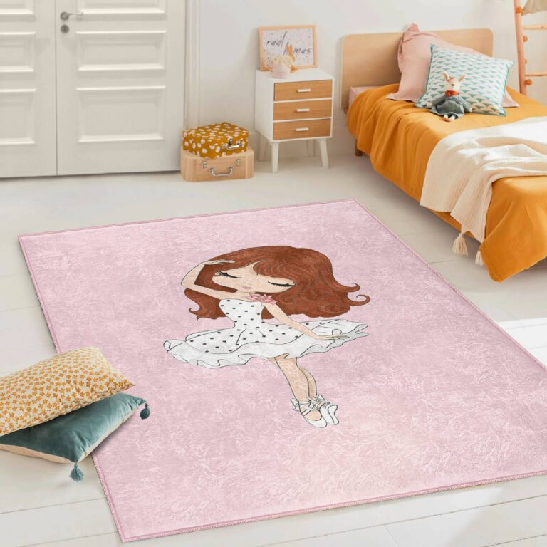 Balerin Desenli Çocuk Halısı – Pembe Zeminde Şirin Ballerina Motifli Yıkanabilir Kaymaz Taban Halı