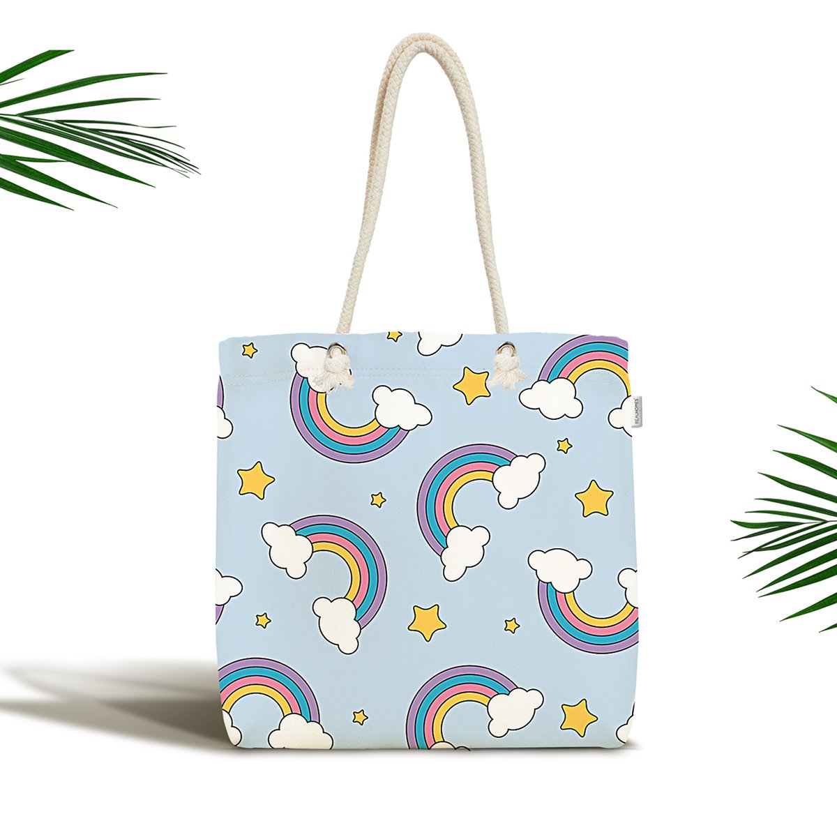 Bebek Çantası – Mavi Zeminde Unicorn Gökkuşağı Dijital Baskılı Modern Kumaş Çanta