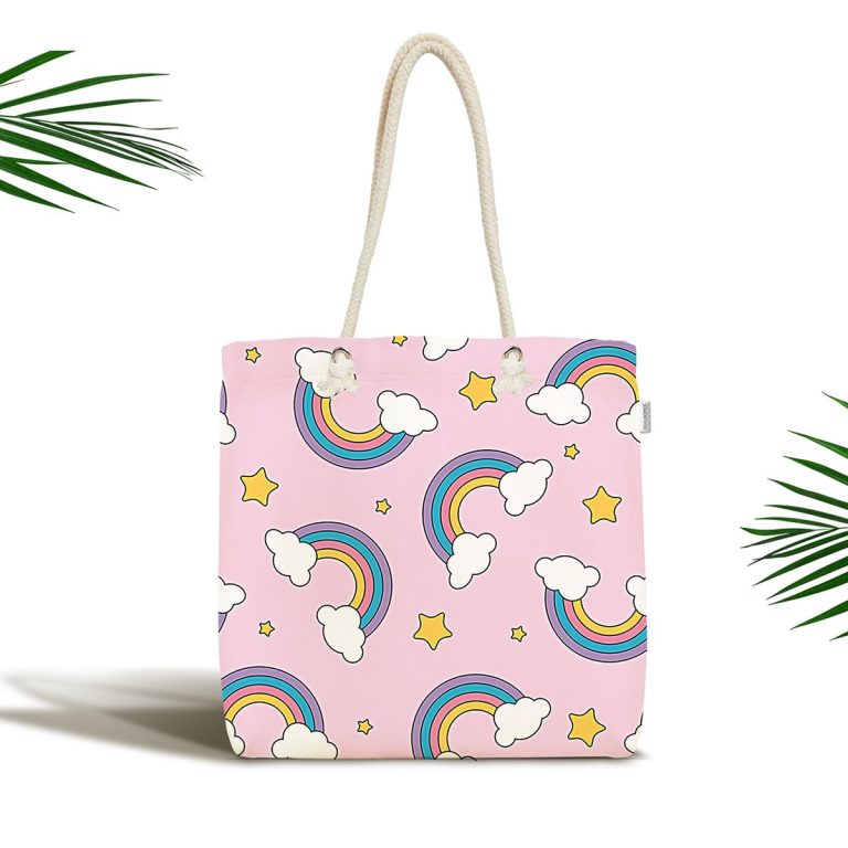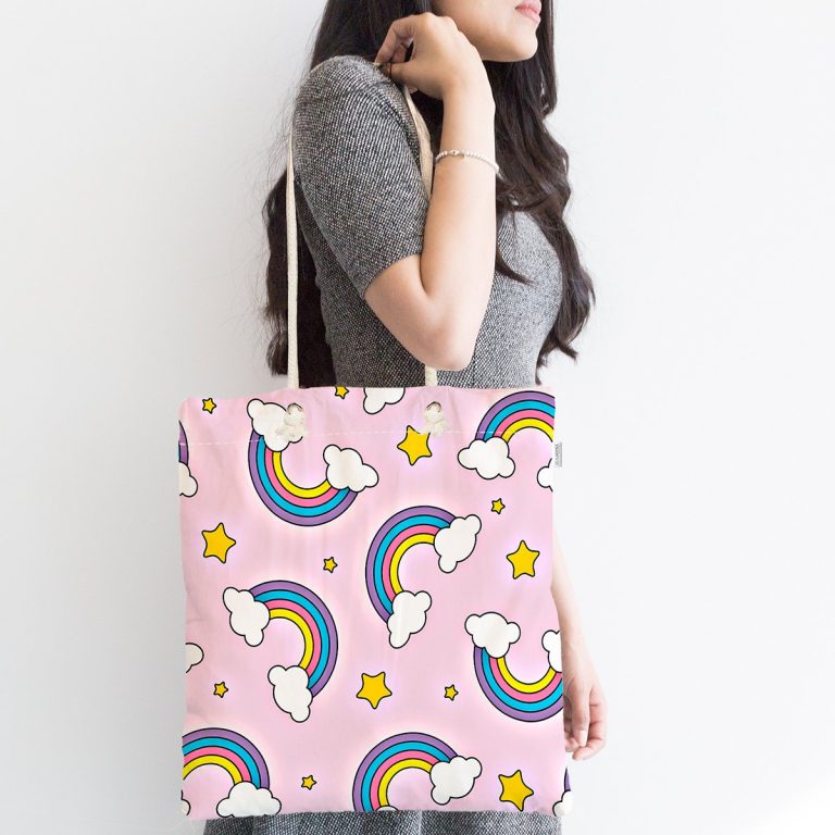 Bebek Çantası – Pembe Zeminde Unicorn Gökkuşağı Dijital Baskılı Modern Kumaş Çanta