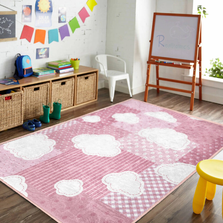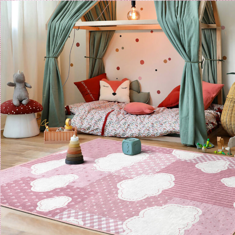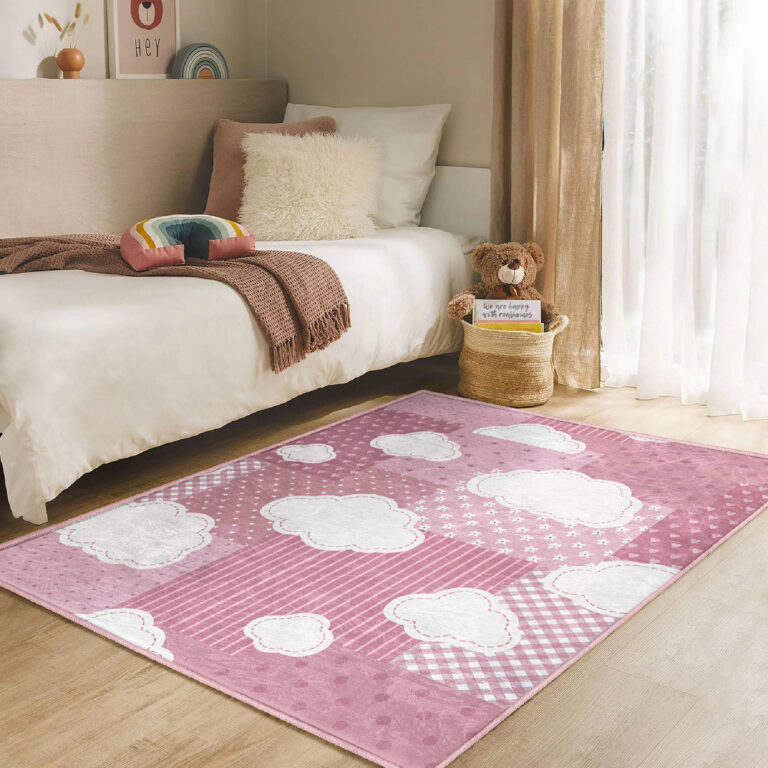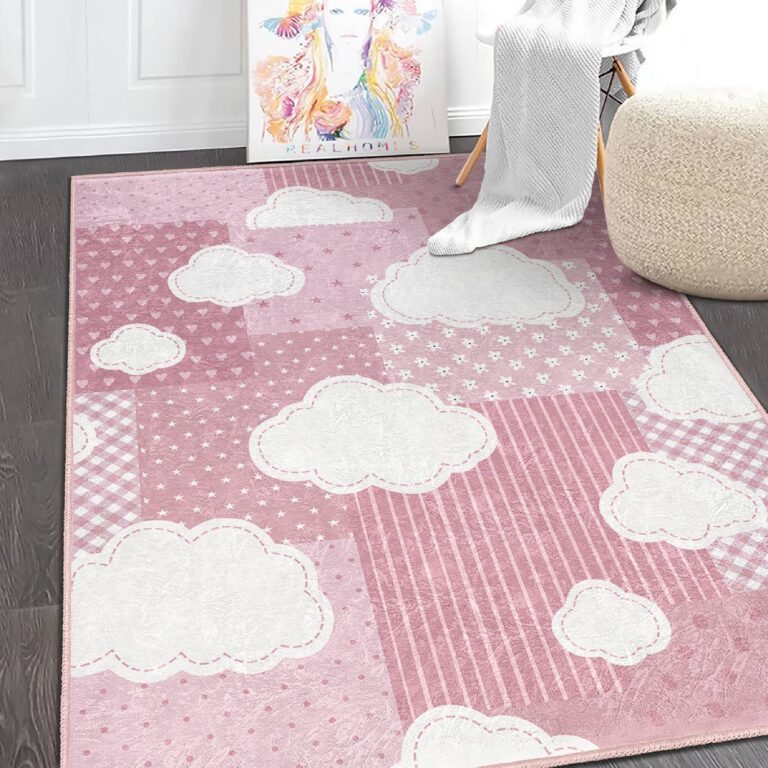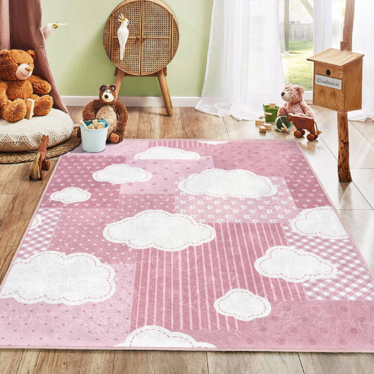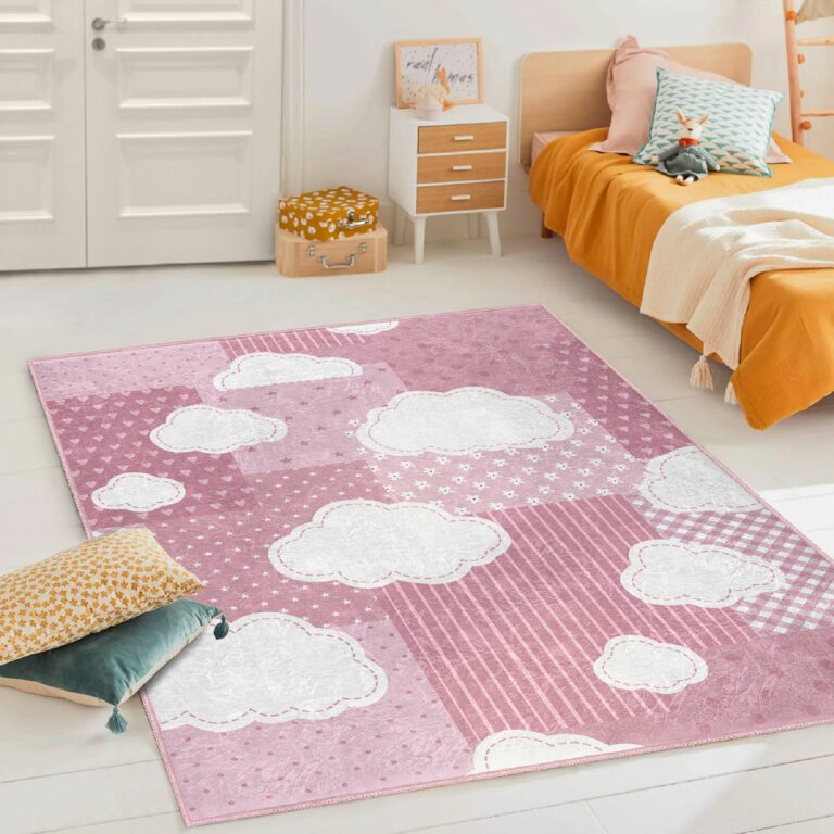 Beyaz Bulut Desenli Pembe Dikdörtgen Çocuk Halısı – Makinede Yıkanabilir Kaymaz Tabanlı
